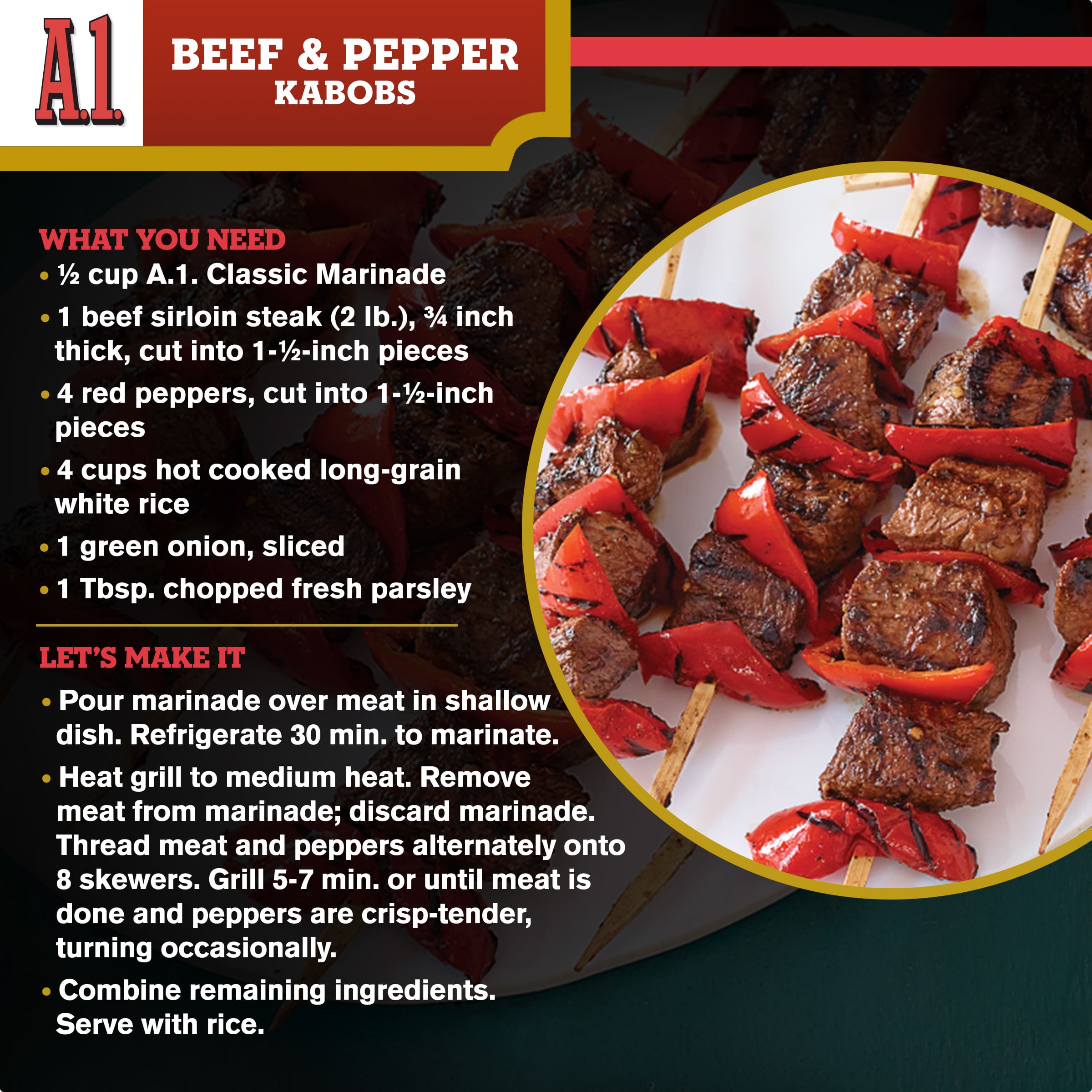 Transform your meals with the bold flavors of A1. Our Classic Marinade is the perfect complement to burgers, steak, chicken, vegetables and more! Sweet and tart tomato puree and vinegar flavors bring out the taste hidden deep within your food, while delivering the classic A1 flavor you love. Use our tangy sauce as a marinade, brush it on while grilling your preferred protein or pour it on your entrée for a boost of flavor. Each 16-ounce squeezable bottle is resealable . With the classic flavor you love, A1 marinade enhances all of your family favorites.