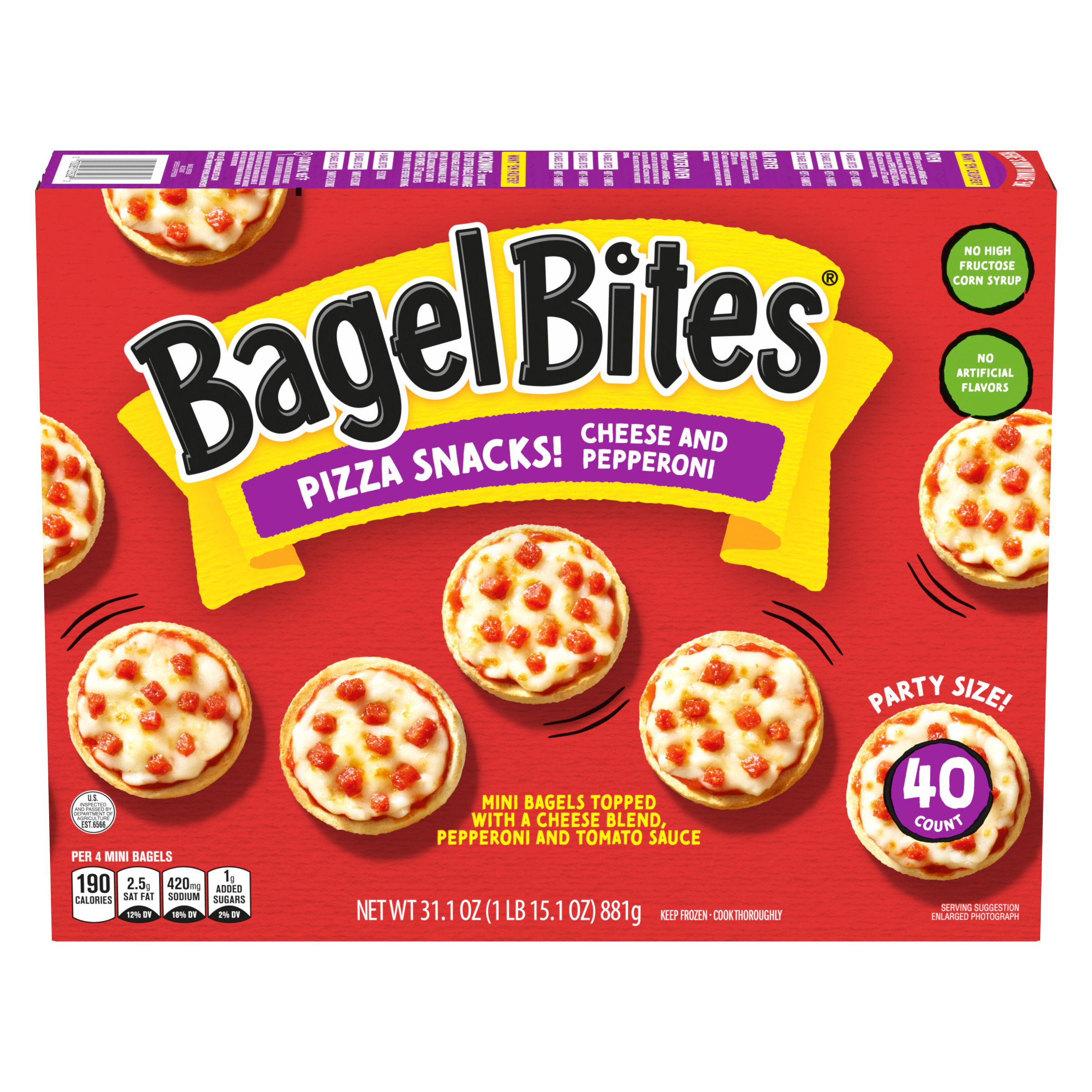 Bagel Bites Cheese & Pepperoni Pizza Snacks offer a quick and easy snack that kids love and parents can easily serve. Our mini pizza bagels are topped with cheese, pepperoni and pizza sauce for a mouthwatering flavor that excites taste buds. Whenever you serve our mini pizza bagels, they're always a hit. Try our frozen appetizers at a party or as an after school snack. Each serving of Bagel Bites has 7 grams of protein, contains 0g trans fat, and no artificial flavors or high-fructose corn syrup. Pepperoni Bagel Bites contain wheat and milk. Suggested serving size is 4 pieces (88g). Cook them in an air fryer, oven or toaster oven for a crispy finish, or microwave them for a quick snack. Each 9-count box of Bagel Bites Cheese & Pepperoni Pizza Snacks includes a convenient microwavable crisping tray for easy prep. Keep our mini pepperoni pizza bagels frozen until ready to eat.
