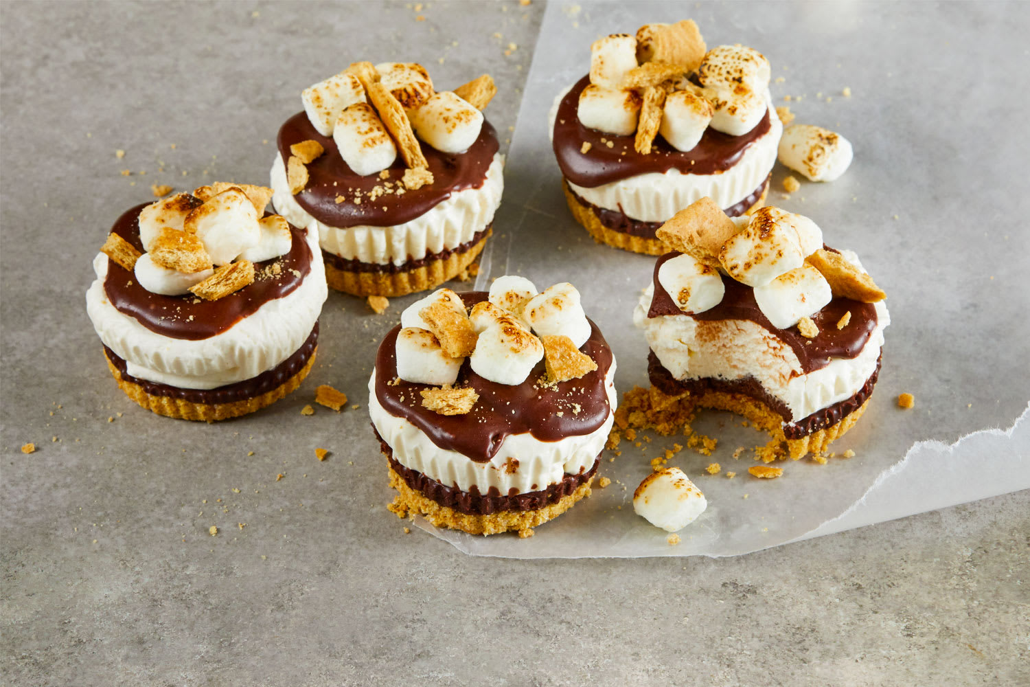 Freeze 2 hours. Remove cheesecakes from liners just before serving; top with marshmallows. Break remaining graham cracker into small pieces; place over cheesecakes.