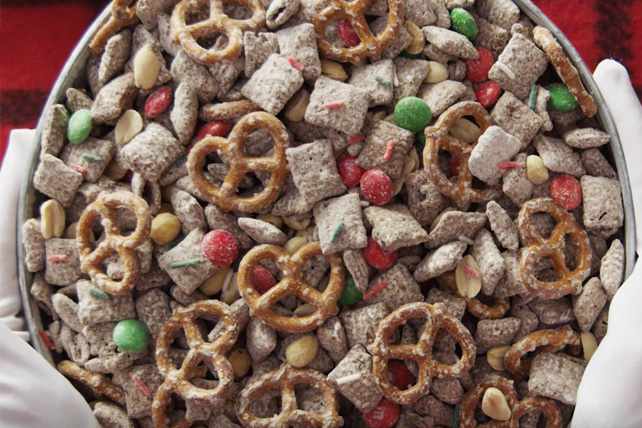 Add pretzels; shake gently. Repeat with nuts, candy-coated chocolate pieces and sprinkles.