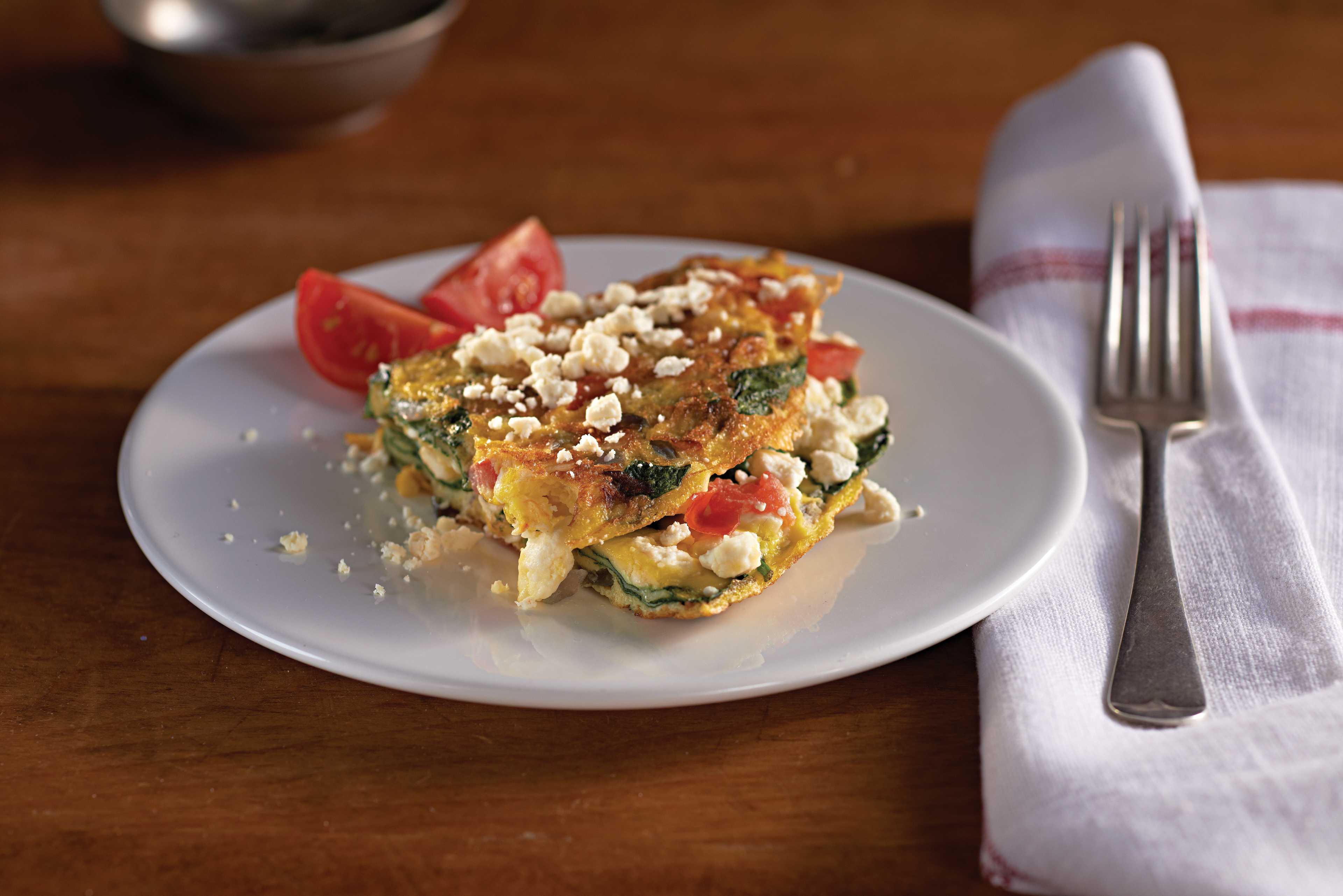 Say 'Greek omelet' with feta cheese, baby spinach leaves and chopped red onions! This Greek Omelet with Feta is the ideal dish for two on a busy day.