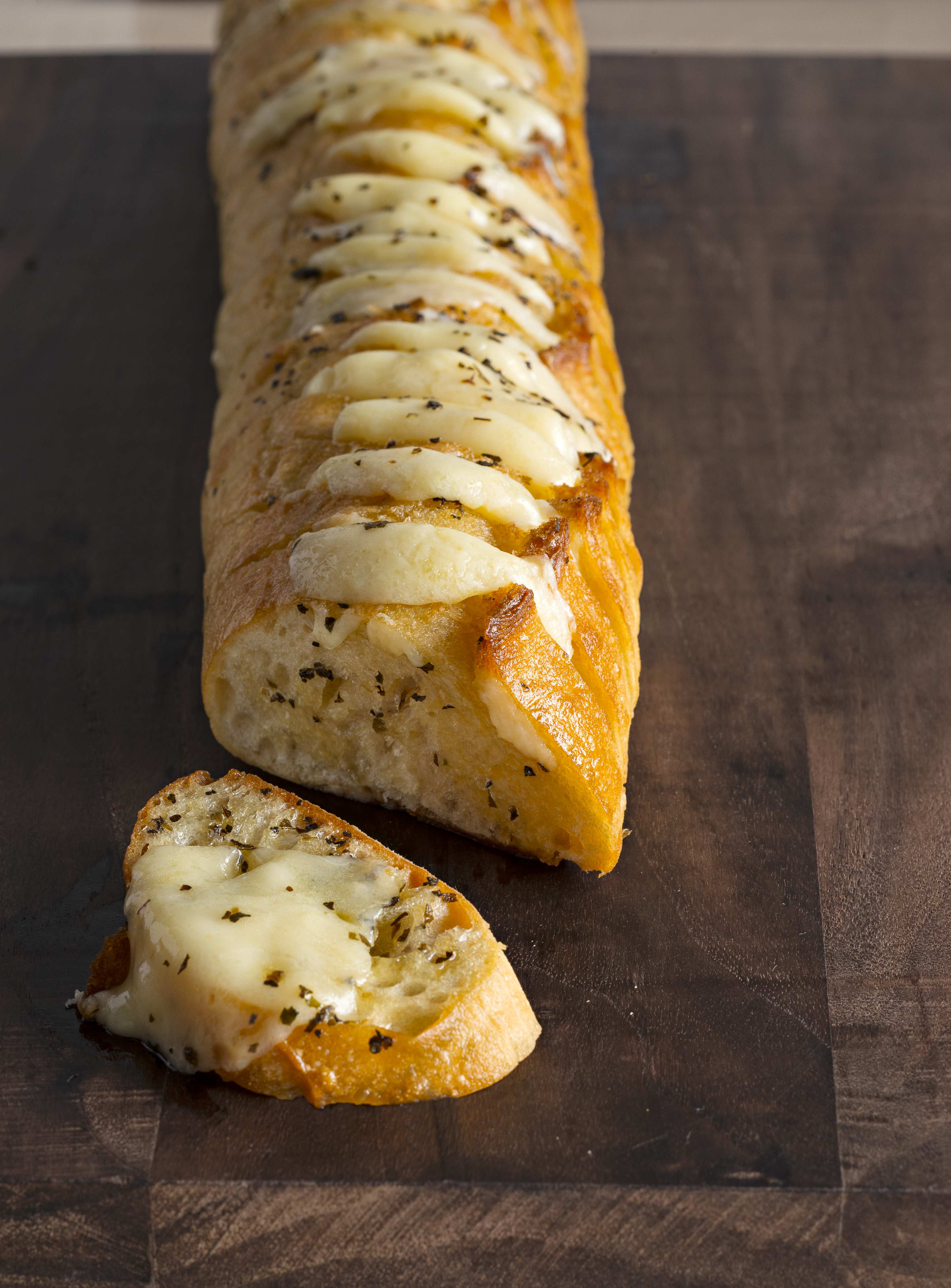 Use serrated knife to make 24 diagonal cuts in top of baguette, being careful to not cut through to bottom of baguette. Place, cut sides up, on baking sheet.