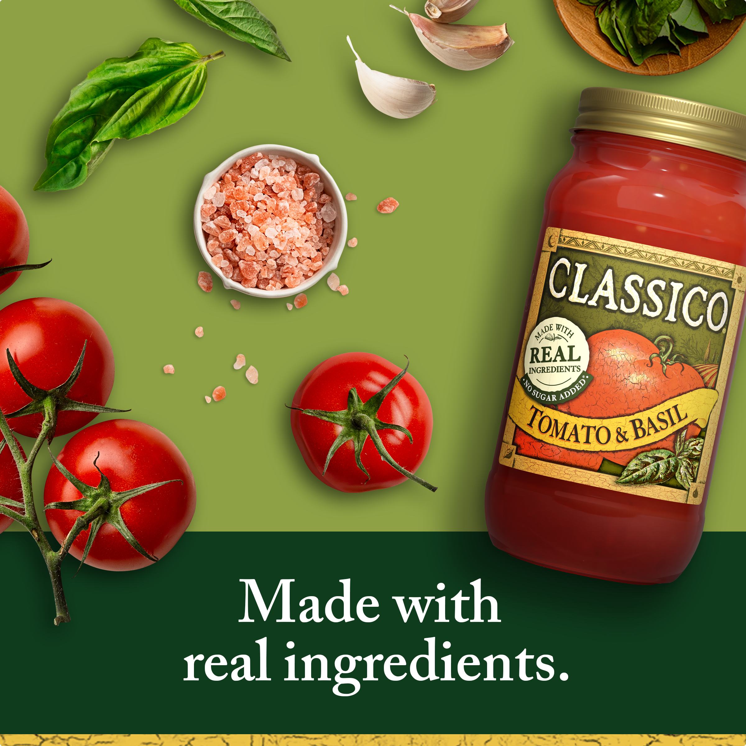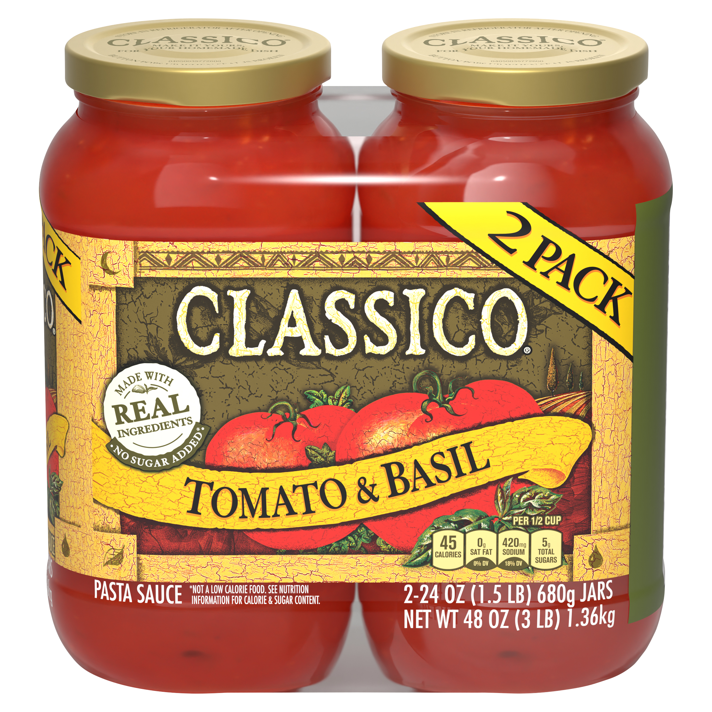 Tomato and basil, the perfect staple for any meal occasion. Classico Tomato & Basil Pasta Sauce is filled with real ingredients that help you create a homemade dish that's authentically delicious. Our sauce is easy to prepare and offers a rich, flavorful taste. Made with real ingredients and no sugar added*, our sauce combines tomatoes with basil for a hearty flavor. Simply simmer and serve our sauce with your favorite meal. Use our red sauce for your chicken Parmesan, lasagna or grilled chicken pasta. You can even try our sauce as a pizza sauce for homemade pizza or a dipping sauce for garlic bread. Stock up with our 2 pack of pasta sauce so you always have some on hand to prepare your family's favorite dishes. Be sure to refrigerate each 24-ounce jar of sauce after opening. Classico pasta sauce has a flavor for everyone in your family, from Tomato & Basil Pasta Sauce to Traditional Sweet Basil Pasta Sauce. Make it yours, for your homemade dish. *Not a low calorie food. See nutrition information for calorie & sugar content.