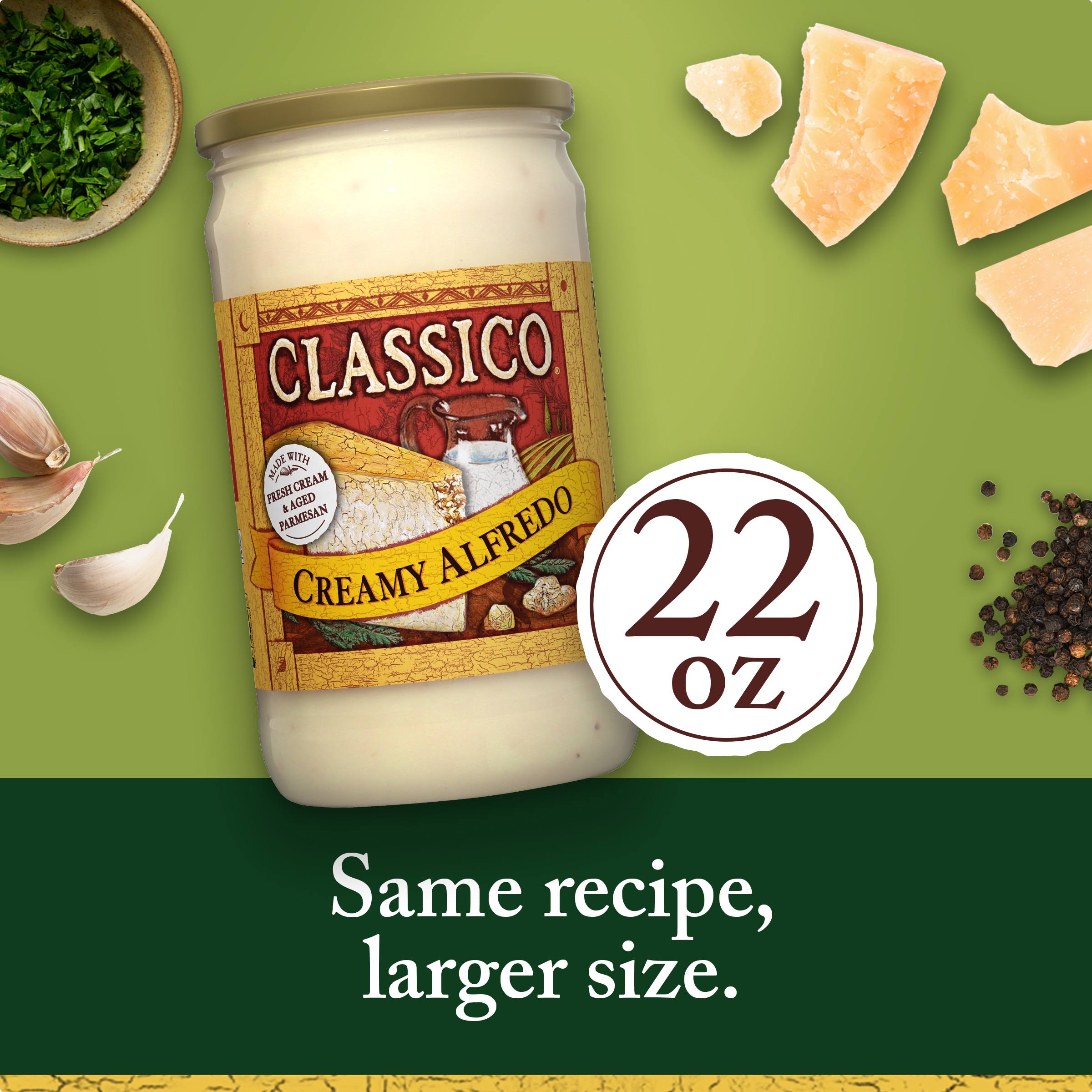 Deliciously creamy and cheesy, the way it should be. Make mouths water with our rich and savory Classico Creamy Alfredo Pasta Sauce. Classico sauce is easy to prepare and offers a rich, flavorful taste. Our creamy, rich Alfredo sauce is crafted with fresh cream and aged Parmesan for an authentic, hearty taste. Simply simmer and serve our sauce with your favorite dish. Use our white sauce for your chicken Alfredo or shrimp pasta. Try Alfredo sauce as a pizza base instead of tomato sauce and top with chicken, spinach and mozzarella for a unique pizza flavor. Be sure to refrigerate our 22-ounce jar of sauce after opening. Classico pasta sauce has a flavor for everyone in your family, from Creamy Alfredo Pasta Sauce to Four Cheese Pasta Sauce. Make it yours, for your homemade dish.