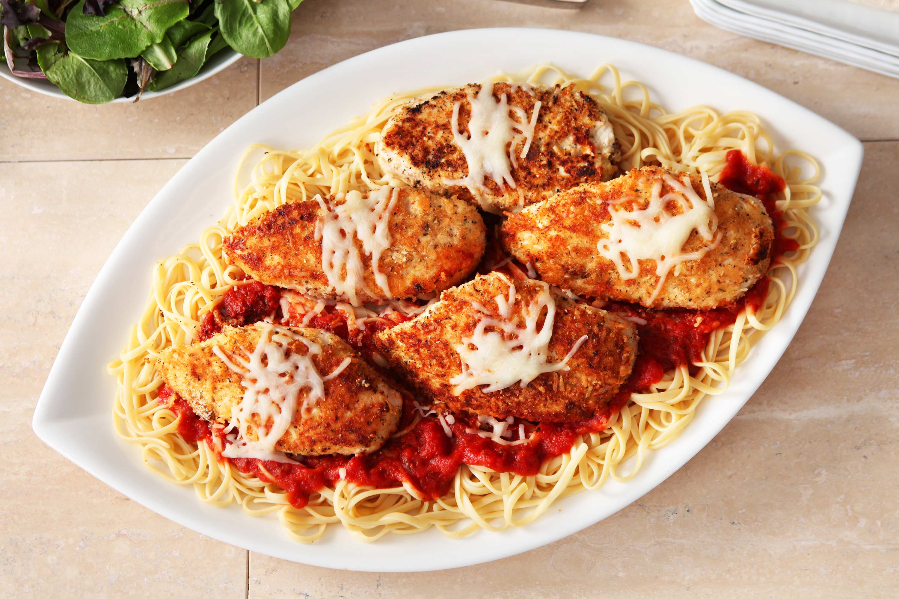 Make a crispy coating of Parm and bread crumbs for Chicken Breasts Parmesan. Add zesty marinara to Chicken Breasts Parmesan for our version of the classic.
