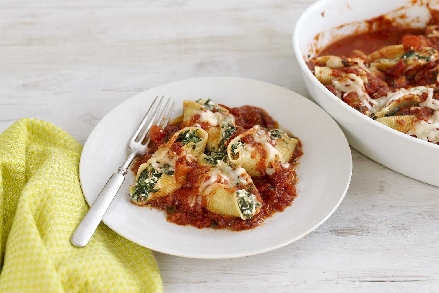 Combine cottage cheese, spinach, Parmesan, seasoning and 1/2 cup mozzarella; spoon into pasta shells. Place in prepared baking dish; top with remaining pasta sauce mixture. Cover.