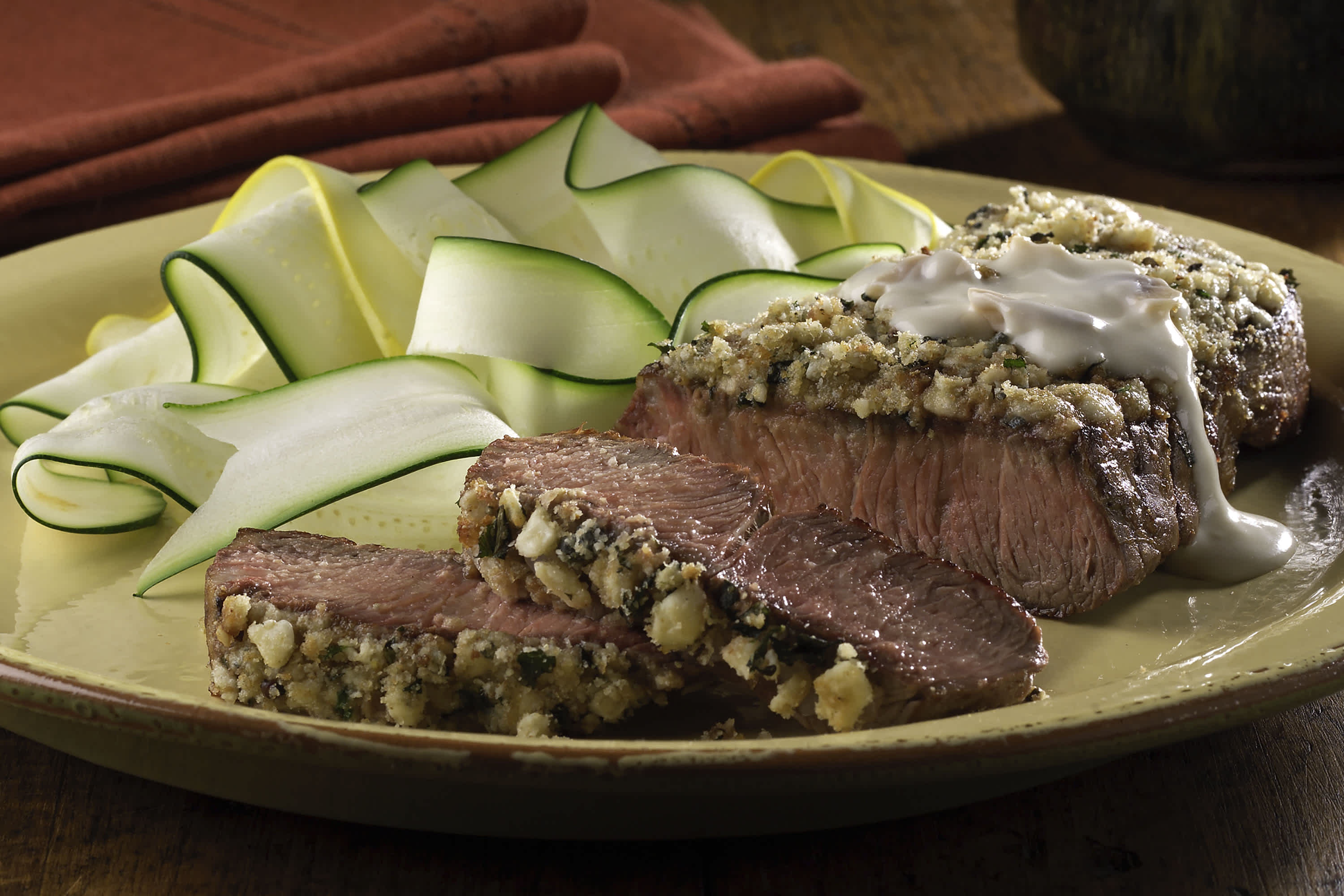 Transfer steaks to baking sheet sprayed with cooking spray; top with cheese mixture.