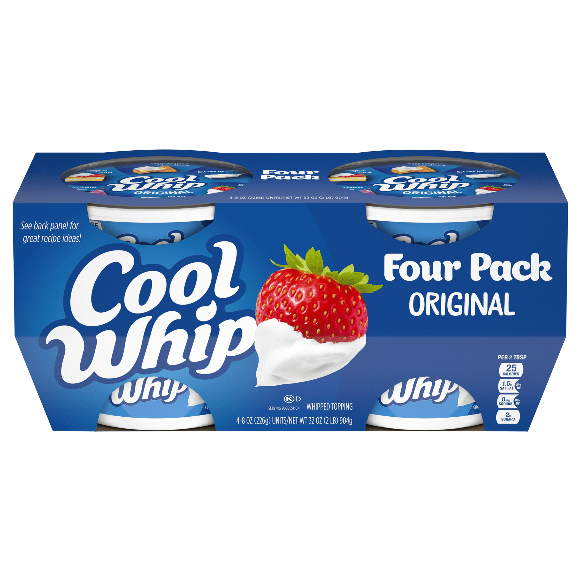 Cool and creamy, delicious and dreamy, Cool Whip is the dollop that makes desserts extra special. So light and fluffy, it adds a cloud of perfection to everything from pies to ice cream sundaes. Cool Whip is a one-of-a-kind creamy whipped topping. Add to your favorite dessert creations like banana pudding, strawberry shortcake or parfaits. Top your hot chocolate, add to a smoothie or dip fresh fruit. The possibilities are endless! Each serving contains only 25 calories and 1.5 grams of fat. Keep our frozen whipped topping in the freezer until ready to thaw and enjoy. Our 8-ounce tub of Cool Whip stays Fridge Fresh for two weeks. Just dollop and enjoy!