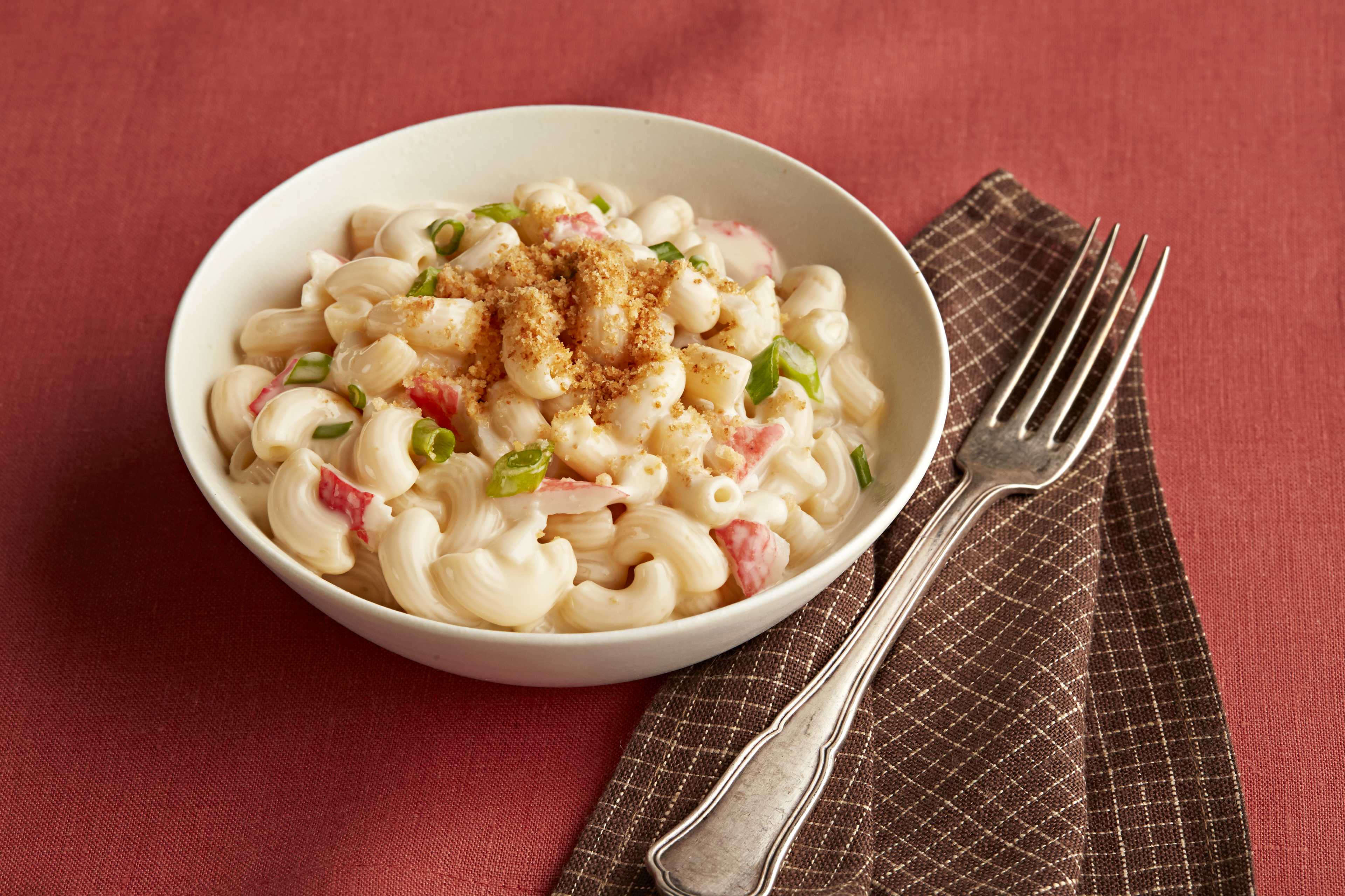 Add crabmeat and onions to Macaroni and Cheese; mix well. Cook on low heat 3 to 5 min. or until heated through, stirring frequently. Sprinkle with bread crumbs.