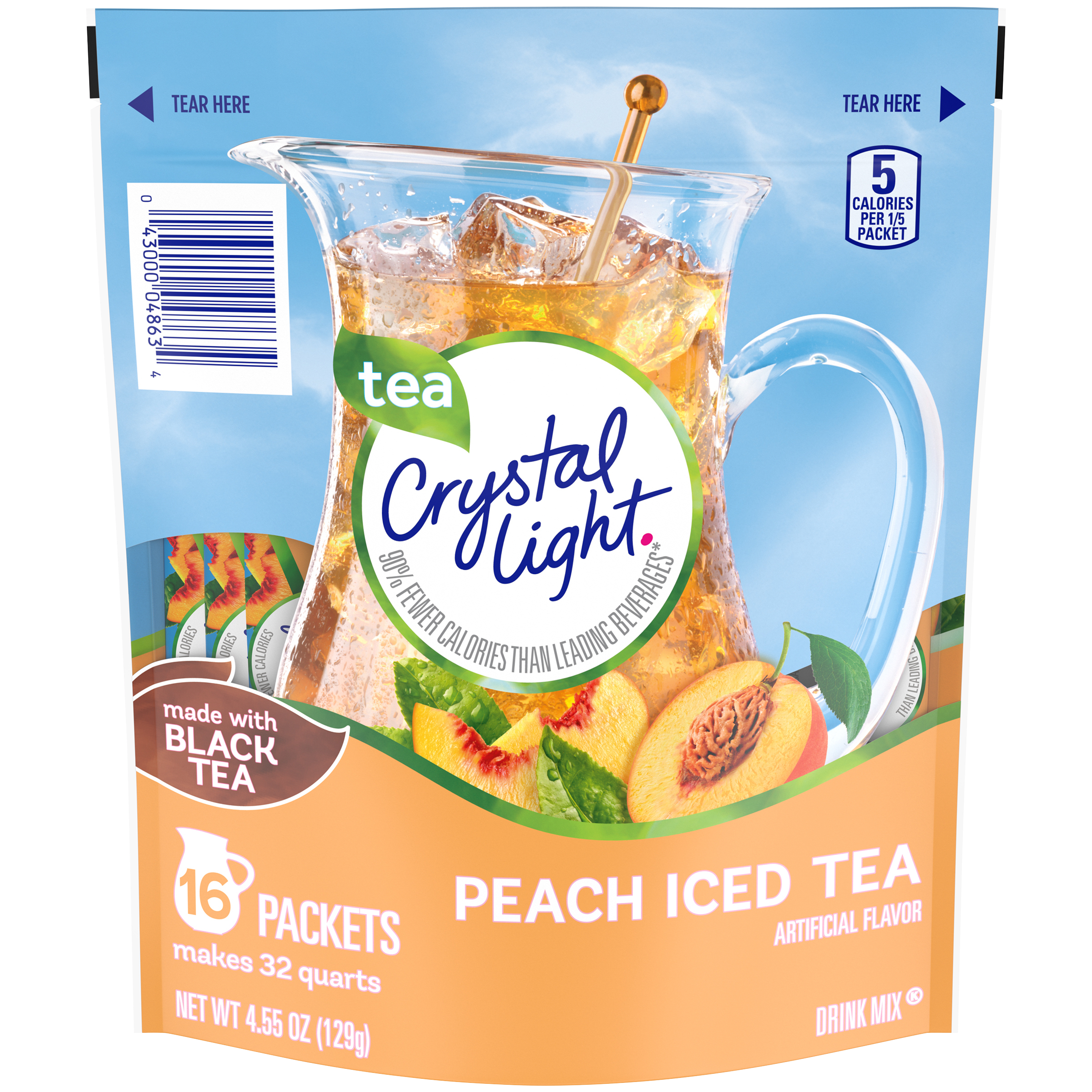 Crystal Light Artificially Flavored Peach Iced Tea Powdered Drink Mix is a refreshing beverage you can enjoy at any time of day. With zero grams of sugar and only 5 calories per serving, Crystal Light is a sweet alternative to juice and soda and has 90 percent fewer calories than leading beverages (this product 5 calories, leading beverages 70 calories), so you don't have to choose between taste and calories. It's also made with real black tea for a refreshingly smooth taste. Each pitcher packet of powdered iced tea mix in this 4 count canister is perfectly portioned to make 2 quarts or 1 pitcher of Crystal Light, so there's plenty to share with family and friends. Simply mix one iced tea packet with 8 cups or 2 quarts of water, stir, and enjoy! All the flavor and only 5 calories... just the way you like it.