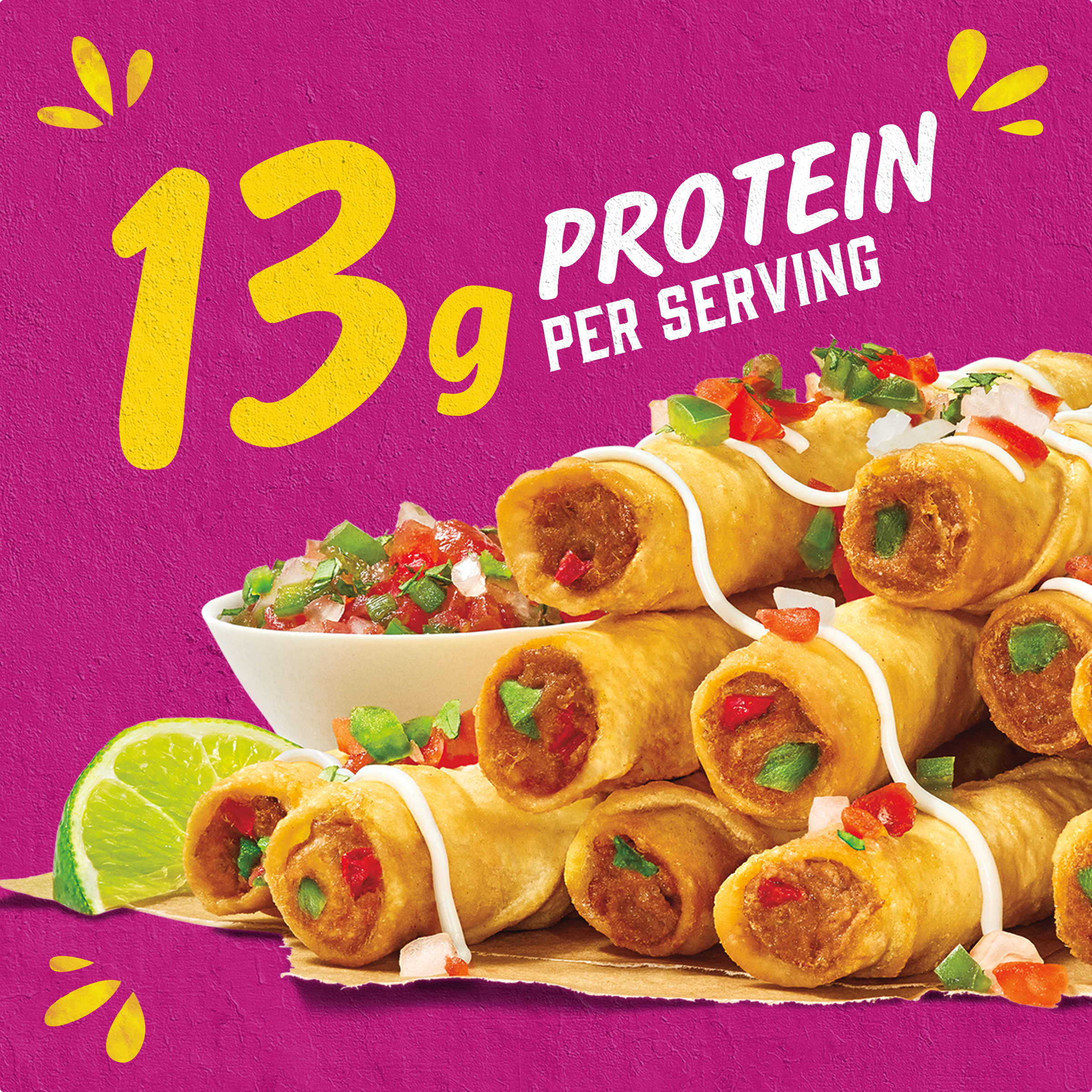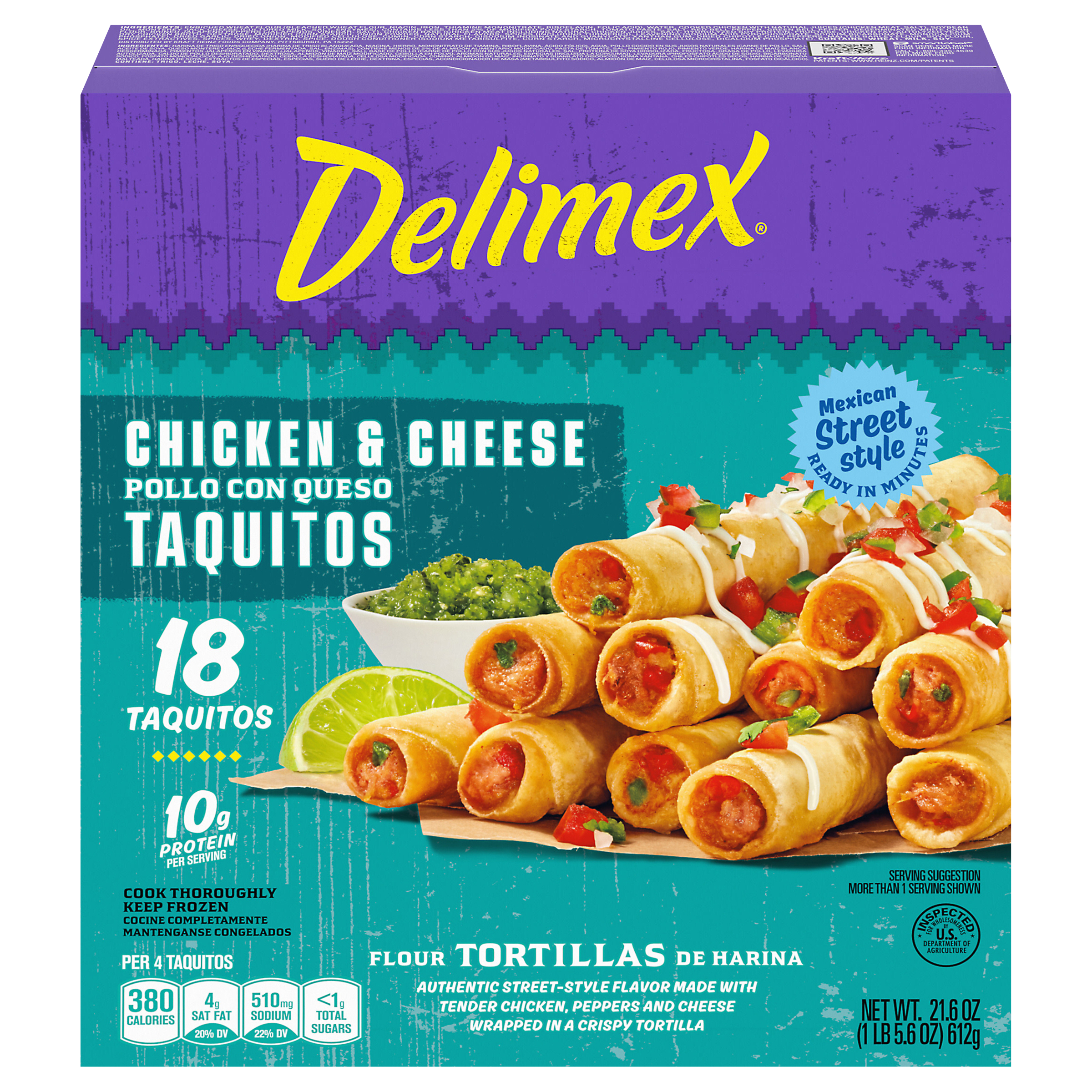 Taste the tradition of authentic, street-style Mexican flavors with Delimex Beef & Cheese Taquitos. Oscar Ancira Sr. founded Delimex in 1984, using Mexican-inspired ingredients and traditional recipes to recreate the savory taste of street-style taco shops. Our frozen taquitos are made with shredded beef with red bell peppers, green bell peppers, jalapeños and melty Colby cheese and wrapped in a crispy flour tortilla. Delimex taquitos can be prepared in the microwave, oven or air fryer, and are ready in minutes. Enjoy our taquitos as an appetizer, snack or part of your dinner, served with salsa, guacamole and sour cream. In each mouthwatering bite, you'll taste the original ingredients that you find in Mexican kitchens. Each 18-count box contains about 4.5 servings, with 13 grams of protein per serving. Store our 21.6-ounce box of frozen taquitos in the freezer until ready to prepare.