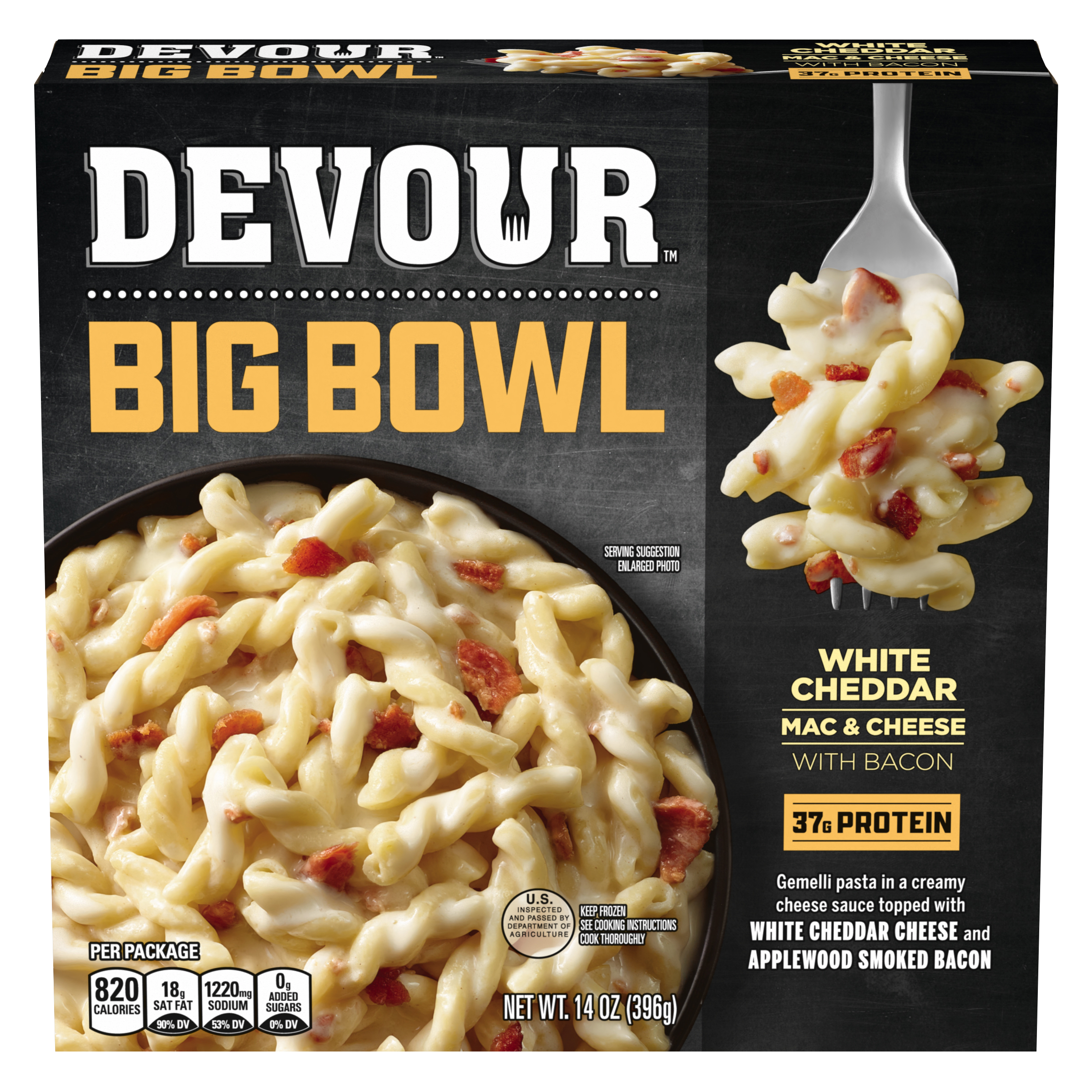 You're gonna need a bigger fork. Devour Big Bowl White Cheddar Mac & Cheese with Bacon features a few delicious twists to the classic mac and cheese recipe. Each serving delivers 37g of protein, packing protein into every bite. We use only top-notch ingredients in our White Cheddar Mac & Cheese with Bacon. First, we begin with spiraled gemelli pasta, then we top it with a super creamy cheese sauce, shredded white cheddar cheese and applewood smoked bacon. Easily prepare Devour Big Bowl White Cheddar Mac & Cheese with Bacon in your microwave. When you get a craving, is it for something spicy? Cheesy? Or maybe you're all about creamy and savory? Whatever you're craving, Devour has the perfect dish. In every recipe, we put big flavor first because we understand it takes extraordinary taste to fulfill a real craving.