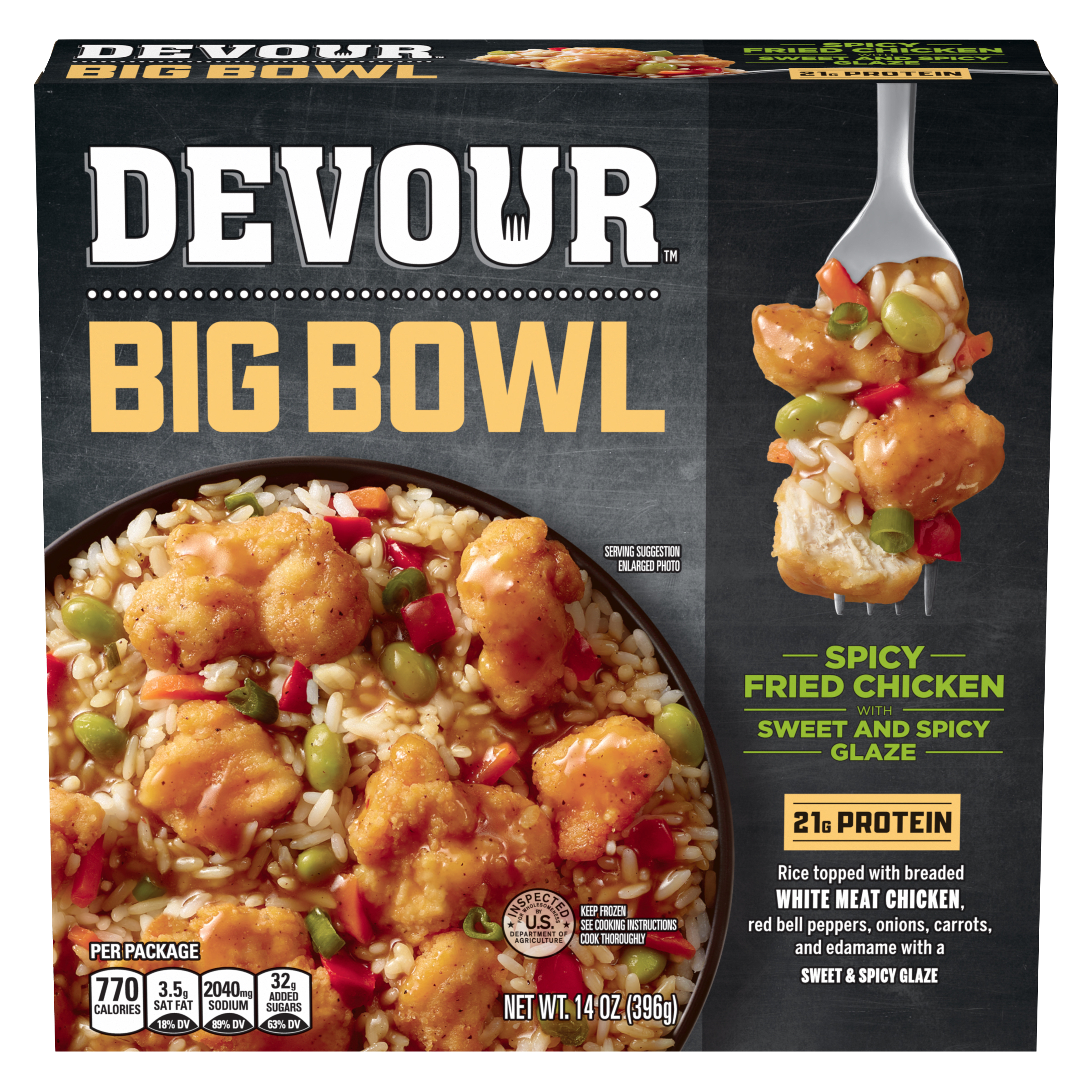 You're gonna need a bigger fork. Devour Big Bowl Spicy Fried Chicken with Sweet and Spicy Glaze features a spicy twist that makes this rice bowl even more delicious. Each serving delivers 21g of protein. We use only top-notch ingredients in our Spicy Fried Chicken with Sweet and Spicy Glaze. First, we begin with fluffy rice, then we top it with a vegetable medley and breaded white meat chicken. Finally, we top it all off with a sweet and spicy glaze and sliced green onions that make every bite better. Easily prepare Devour Big Bowl Spicy Fried Chicken with Sweet and Spicy Glaze in your microwave. When you get a craving, is it for something spicy? Cheesy? Or maybe you're all about creamy and savory? Whatever you're craving, Devour has the perfect dish. In every recipe, we put big flavor first because we understand it takes extraordinary taste to fulfill a real craving.