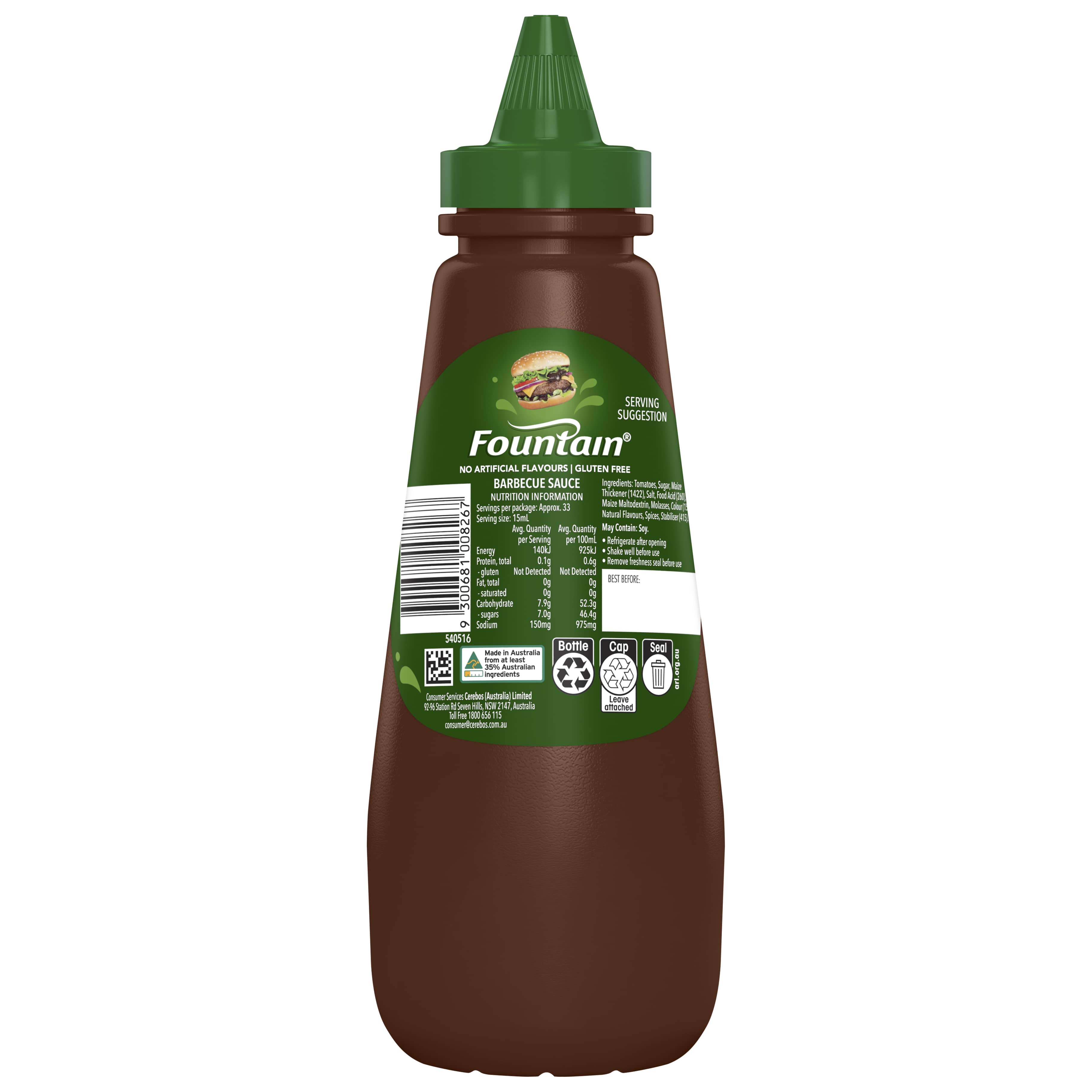 Burgers, bacon and egg rolls and barbecued meat aren't complete without Fountain® Barbecue Sauce. Whether you use our barbecue sauce as a dip, a marinade or cooked into a home made dish, you really can't beat that delicious Fountain® taste. Fountain® Barbecue Sauce adds flavour to any dish. An essential for backyard barbecues and family burger nights, it also comes in handy for lunches on-the-go, weekend breakfasts, and as a sauce for pizza. Fountain® Barbecue Sauce contains no artificial flavours and is gluten free too, great for the whole family to enjoy. • Barbecue sauce • The ideal condiment for burgers, chips and sandwiches • Perfect for meat marinades • No artificial flavours • Gluten free