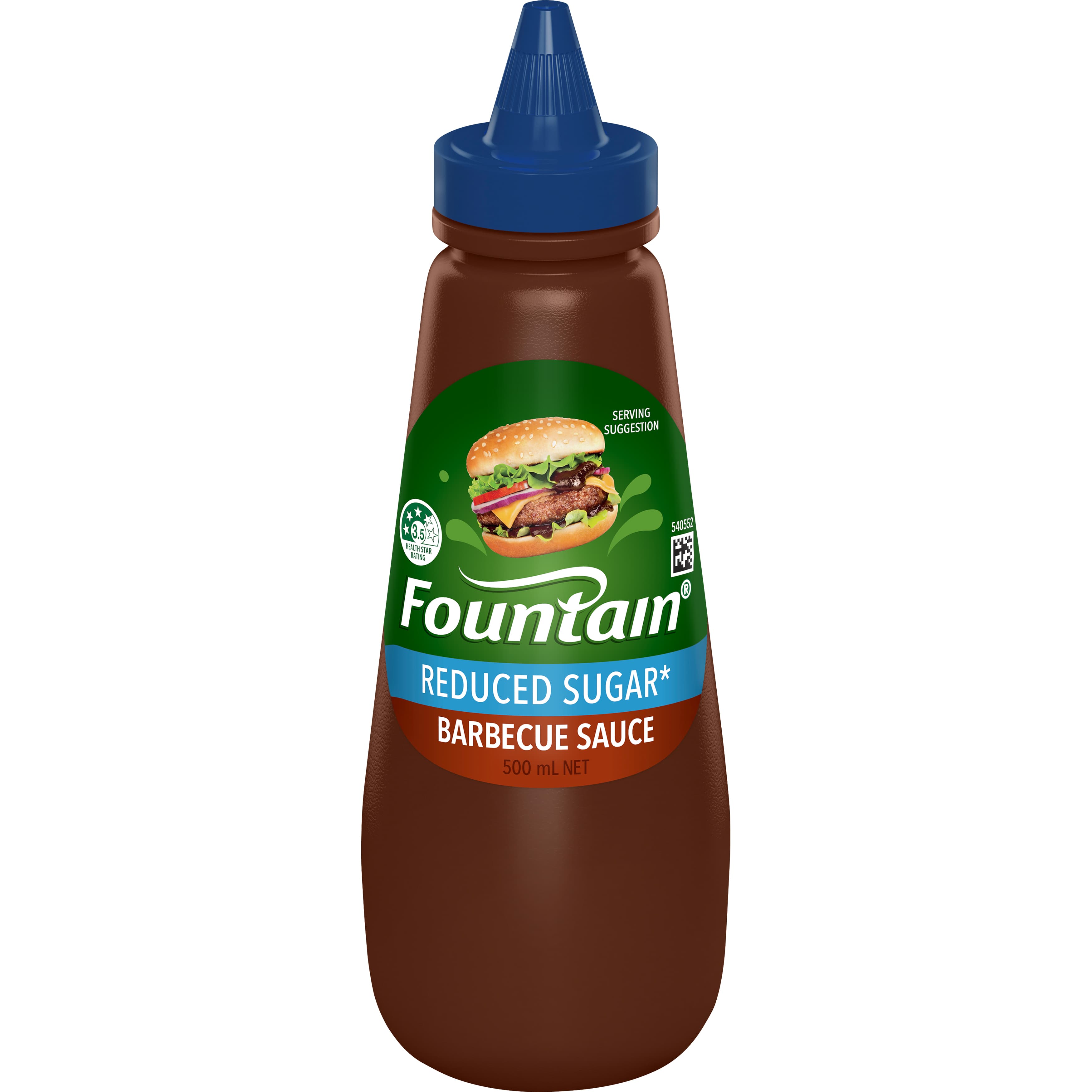 The ideal choice for meat, barbecued food or even as a dipping sauce for hot chips and onion rings, Fountain® Barbecue Sauce Reduced Sugar has 85% less sugar and 30% less sodium compared to regular Fountain® Barbecue Sauce 500mL. An excellent staple for cooking and marinating, it is a delicious addition to any meal. Fountain® Barbecue Sauce Reduced Sugar is an essential condiment for home cooked meals with 85% less sugar and 30% less sodium compared to regular Fountain® Barbecue Sauce 500mL. Mix with spices for an easy and delicious marinade for chicken wings or pork ribs, or simply enjoy as a sauce with your weekend big breaky. Fountain® Barbecue Sauce Reduced Sugar contains no artificial flavours and is gluten free. • Reduced sugar* barbecue sauce • Great for dipping and marinating • *85% less sugar and 30% less sodium compared to regular Fountain® Barbecue Sauce 500mL • Gluten free • No artificial flavours