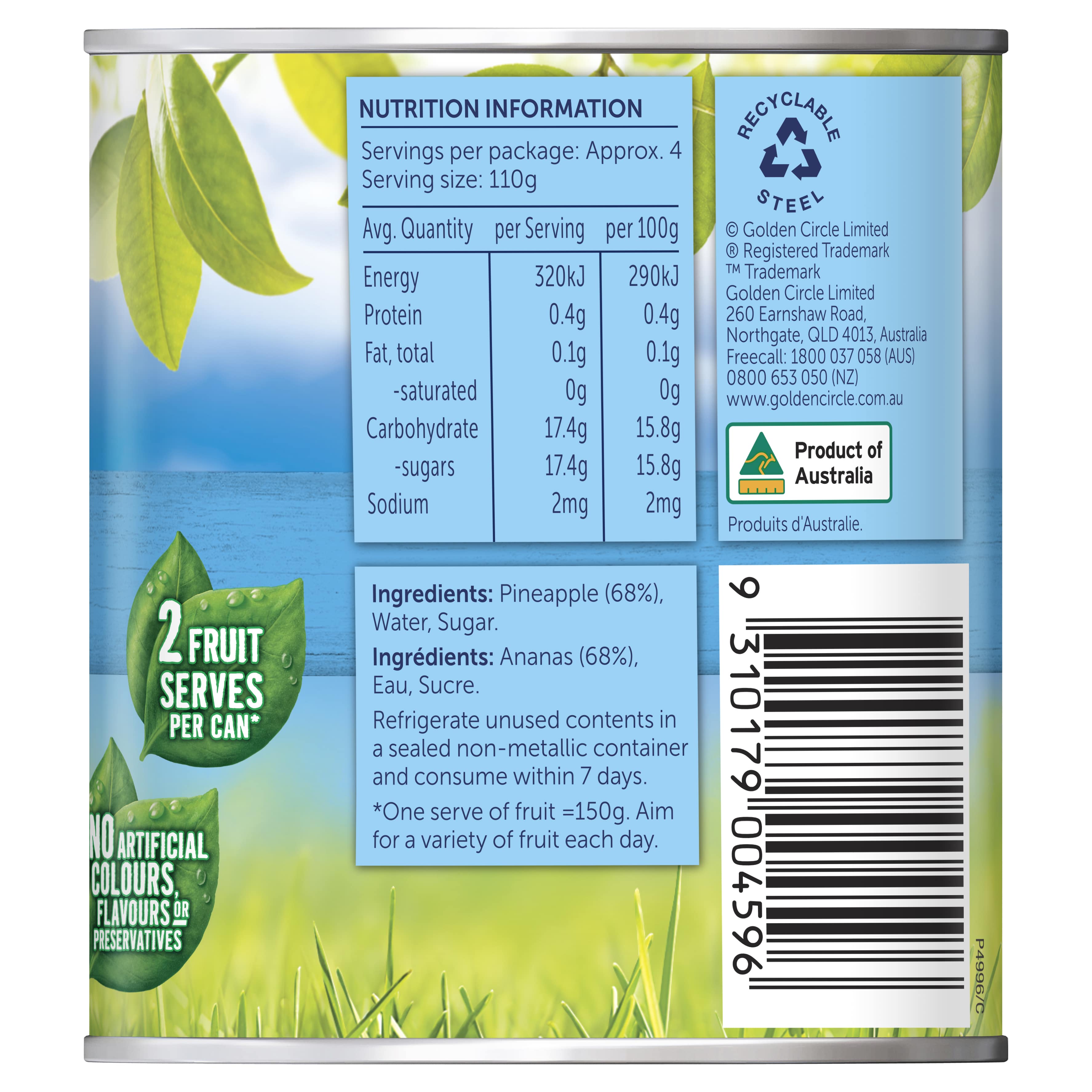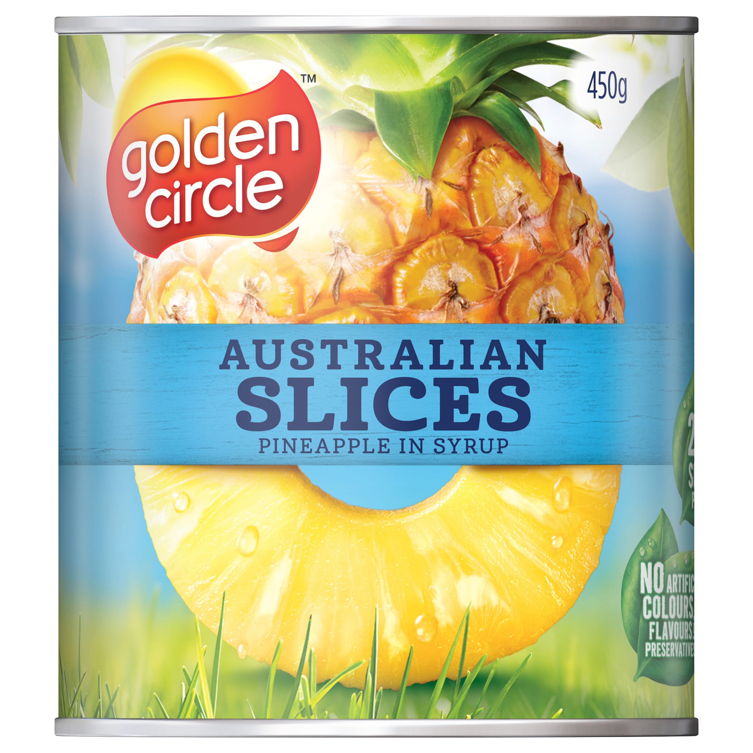 Perfectly sliced and ready to use, Golden Circle® Australian Slices Pineapple in Syrup contain no artificial colours, flavours or preservatives. These slices are great for burgers, cakes or just as a fruity afternoon snack. If you're making a pineapple upside down cake, Golden Circle® Australian Slices Pineapple in Syrup is the must-have ingredient. Get baking with the whole family - everyone is sure to love anything you cook with these pineapple slices. • No artificial colours, flavours or preservatives • Pineapple slices in syrup • 2 fruit serves per can (One serve of fruit = 150g. Aim for a variety of fruit each day.) • Delicious combination of pineapple and syrup, perfect for dessert • Also ideal for baked goods; use it to create your own pineapple upside down tart