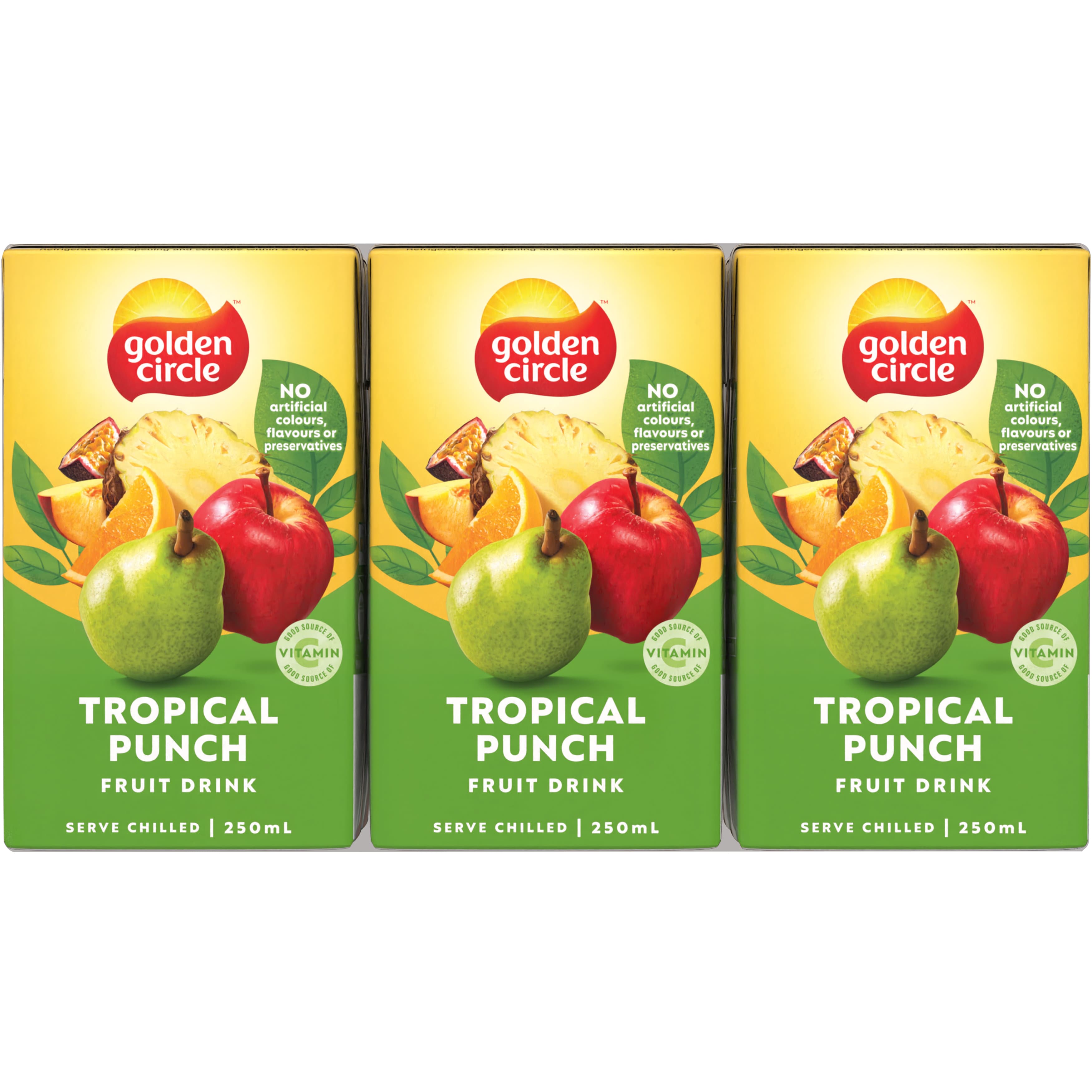 Delicious Golden Circle® Tropical Punch Fruit Drink has all your favourite tropical flavours, and is sure to be a hit at birthday parties and events. As soon as the sun comes out, it's time to bring out Golden Circle® Tropical Punch Fruit Drink. A fruit drink with a good source of vitamin C, Golden Circle® Tropical Punch Fruit Drink is made with no artificial colours, flavours or preservatives. Enjoy it straight from the carton or make homemade ice blocks. Golden Circle®, Share the Sunshine. • No artificial colours • No artificial flavours • No preservatives • Good source of vitamin C • Perfect size for bringing to picnics and beach trips
