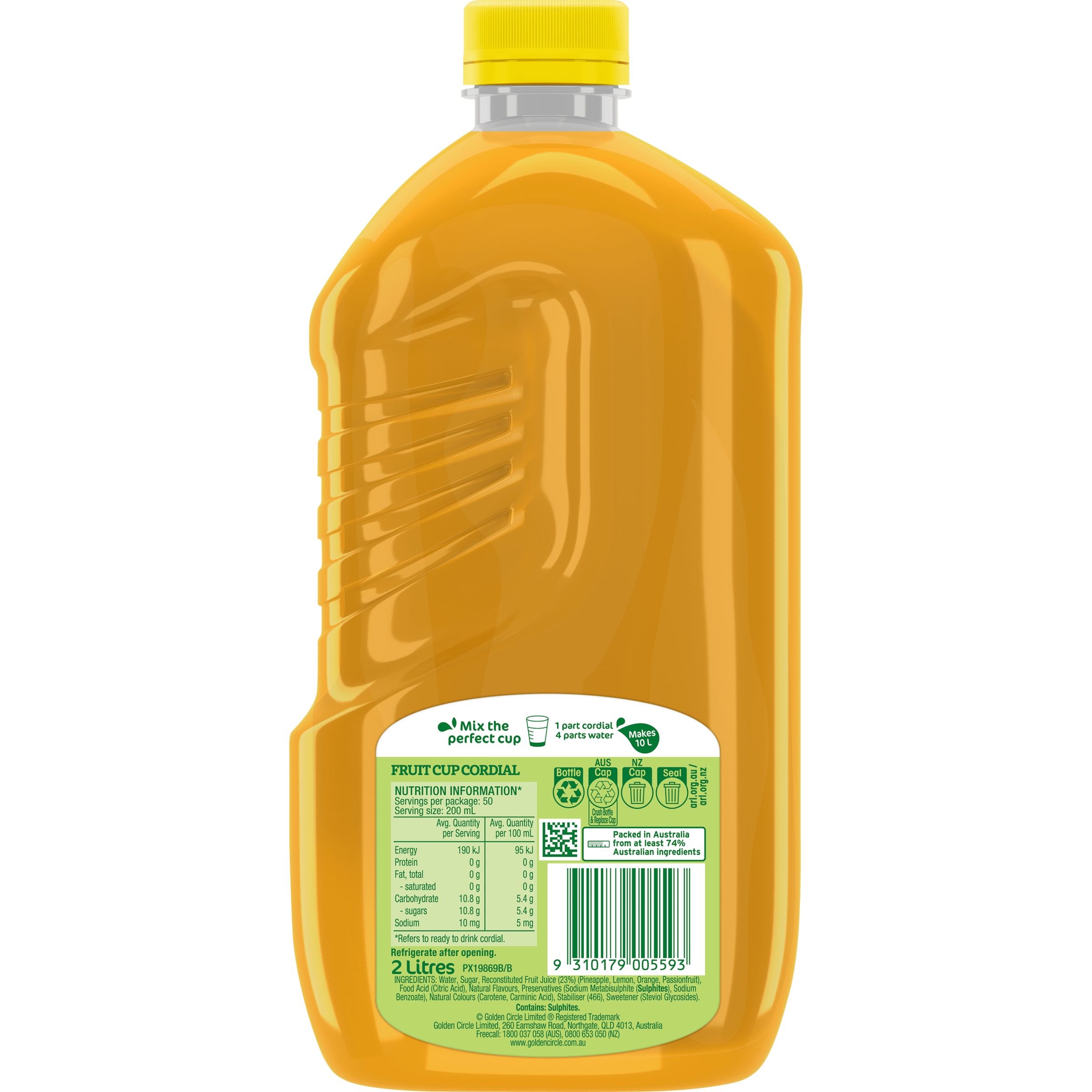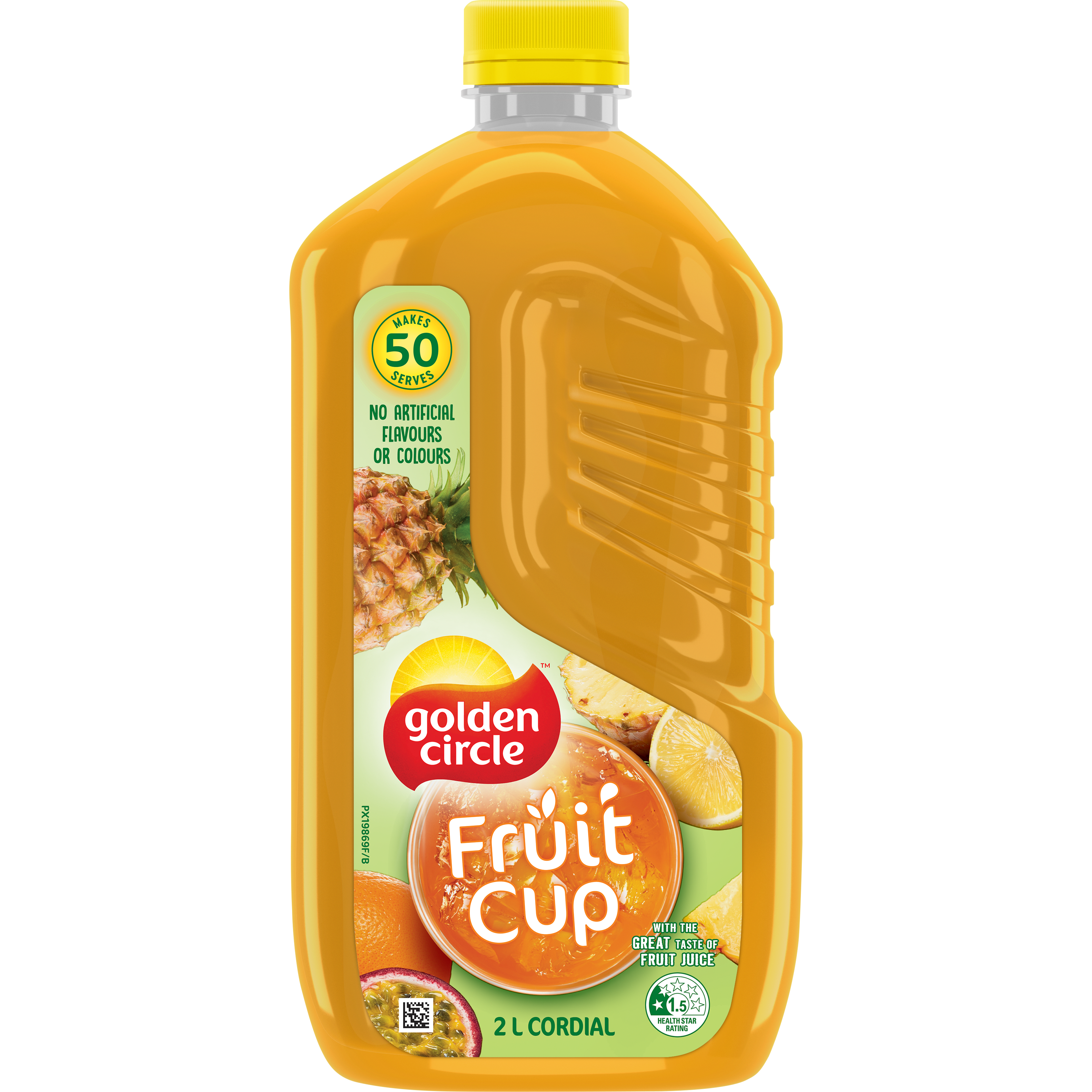 With the great taste of fruit juice, Golden Circle® Fruit Cup Cordial is a fun choice for birthday parties and backyard picnics. Mix the perfect cup...