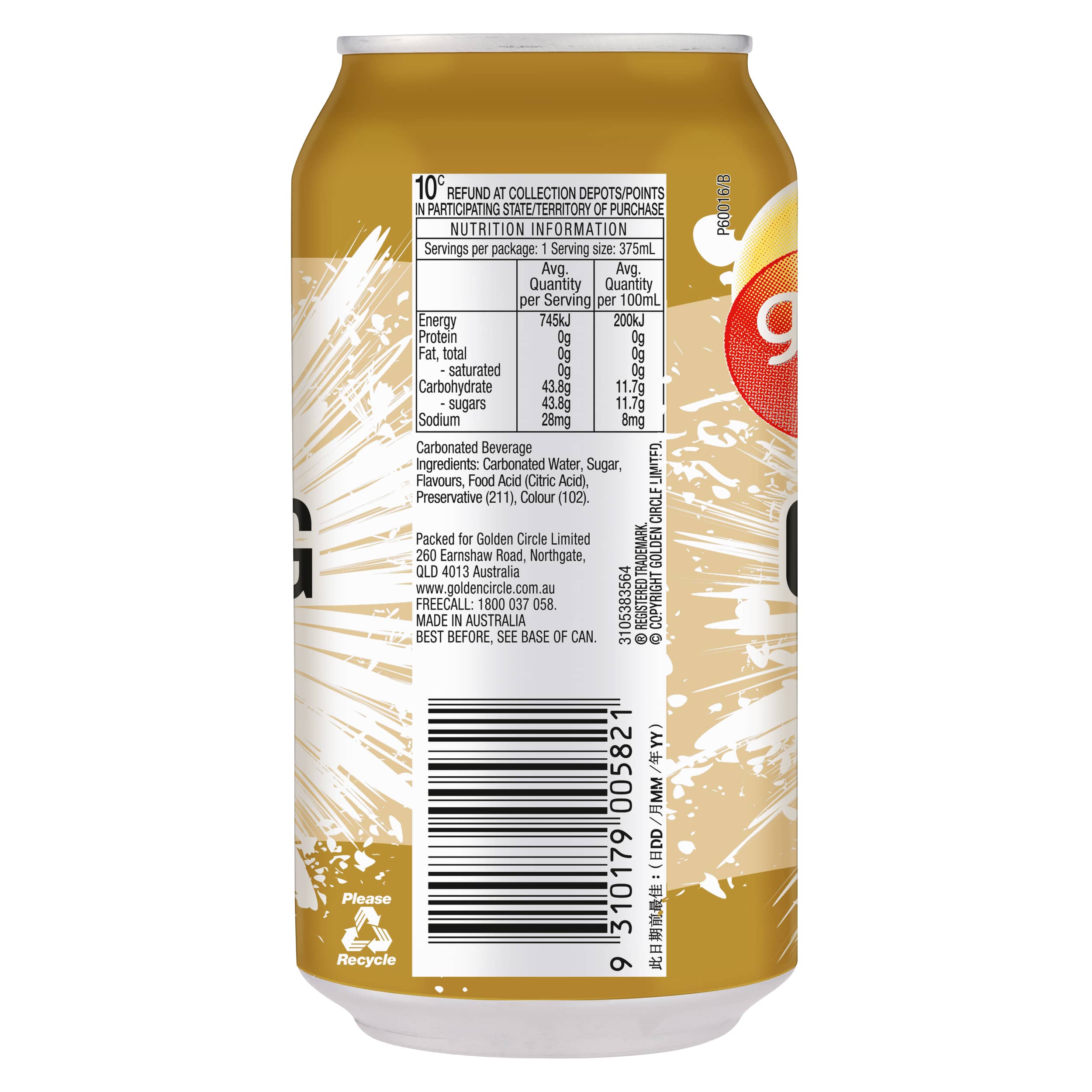 Golden Circle® Creaming Soda is a sweetly satisfying drink. It's great for sunny days spent outdoors at the beach or at a park with friends. You know you've picked a good drink just by looking at Golden Circle® Creaming Soda's eye-catching can. The taste is equally satisfying, perfect for catching up with your friends or watching some weekend sport with your family. The canned format also makes it easy to pack for road trips. • Sweetly satisfying flavoured soft drink • Great drink for summer • Perfect for barbecues and parties • Classic flavour loved by all ages • Convenient 375mL can is easy to pack for on-the-go