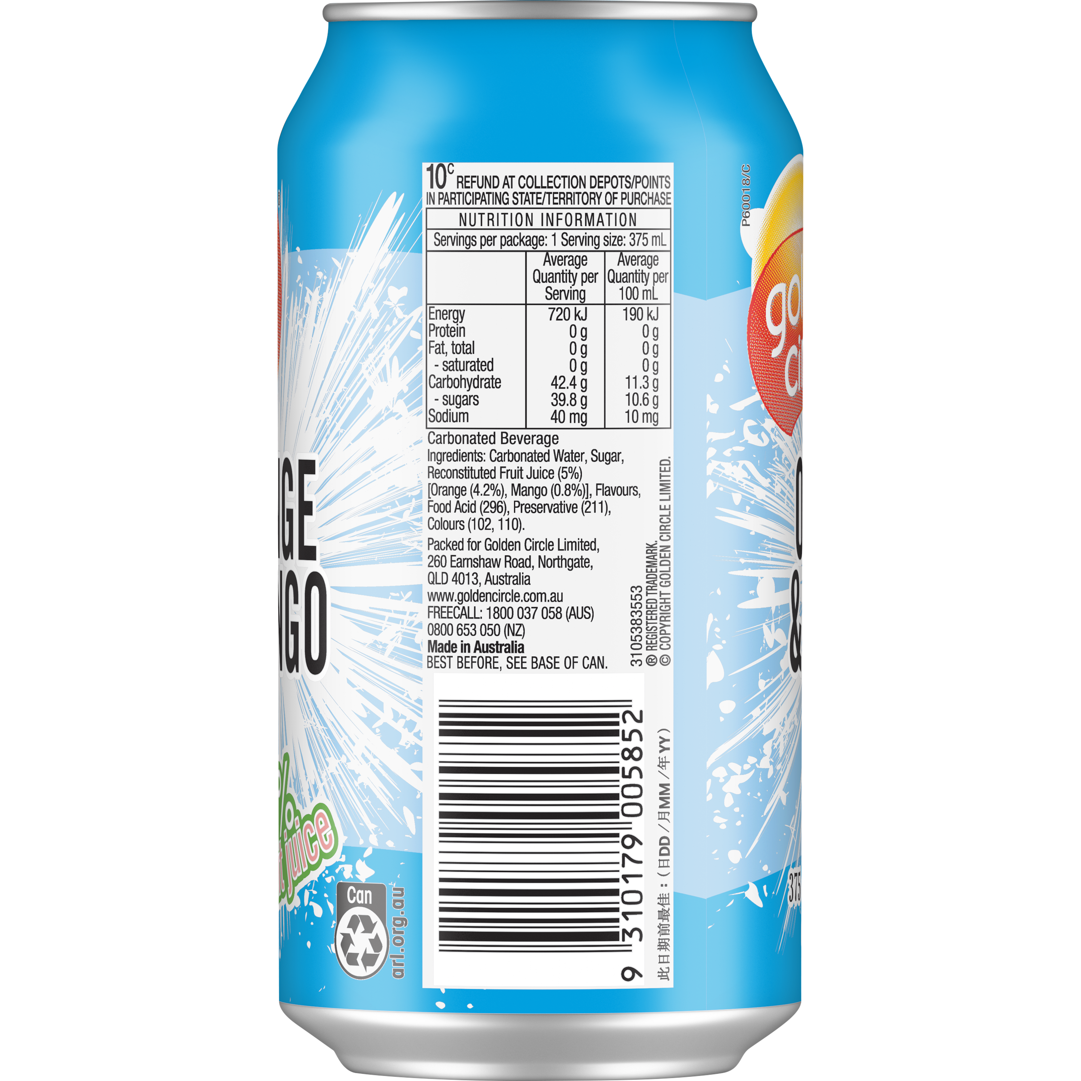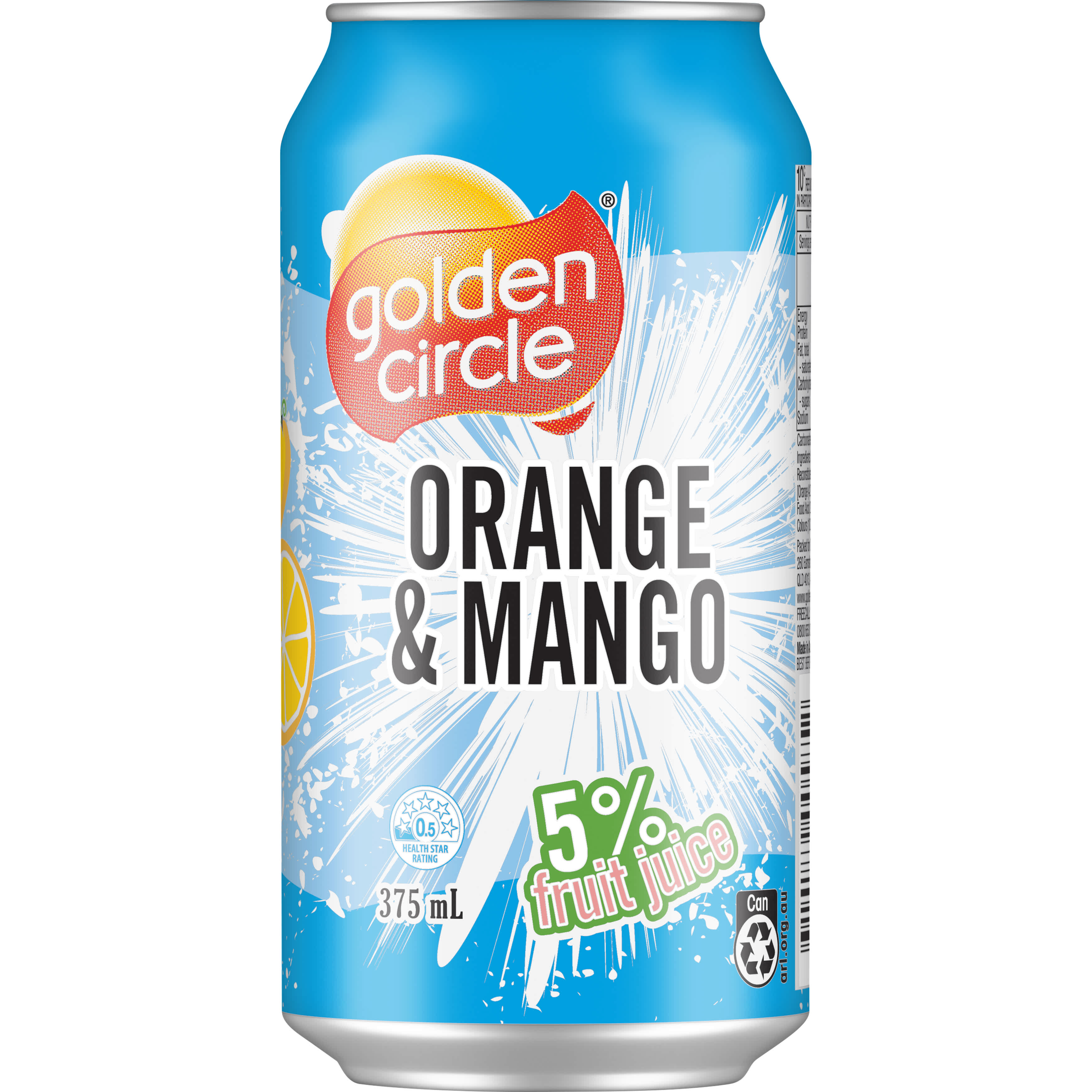 Golden Circle® Orange & Mango Soft Drink combines two delicious flavours in one soft drink. Made with 5% fruit juice, this canned soft drink is deliciously sweet with a touch of fizz, making it a great choice for summer parties or a beach trip. Can't choose between orange and mango? Golden Circle® Orange & Mango Soft Drink lets you enjoy both. This can of orange & mango flavoured fizzy drink made with 5% fruit juice is a delicious choice sure to deliver a memorable mouthwatering experience. Packed in a can, Golden Circle® Orange & Mango Soft Drink can be easily enjoyed on road trips with friends or at the beach. • Orange and mango flavoured • Contains 5% fruit juice • Delicious drink for parties and barbecues • Great for camping and beach days • Best served chilled