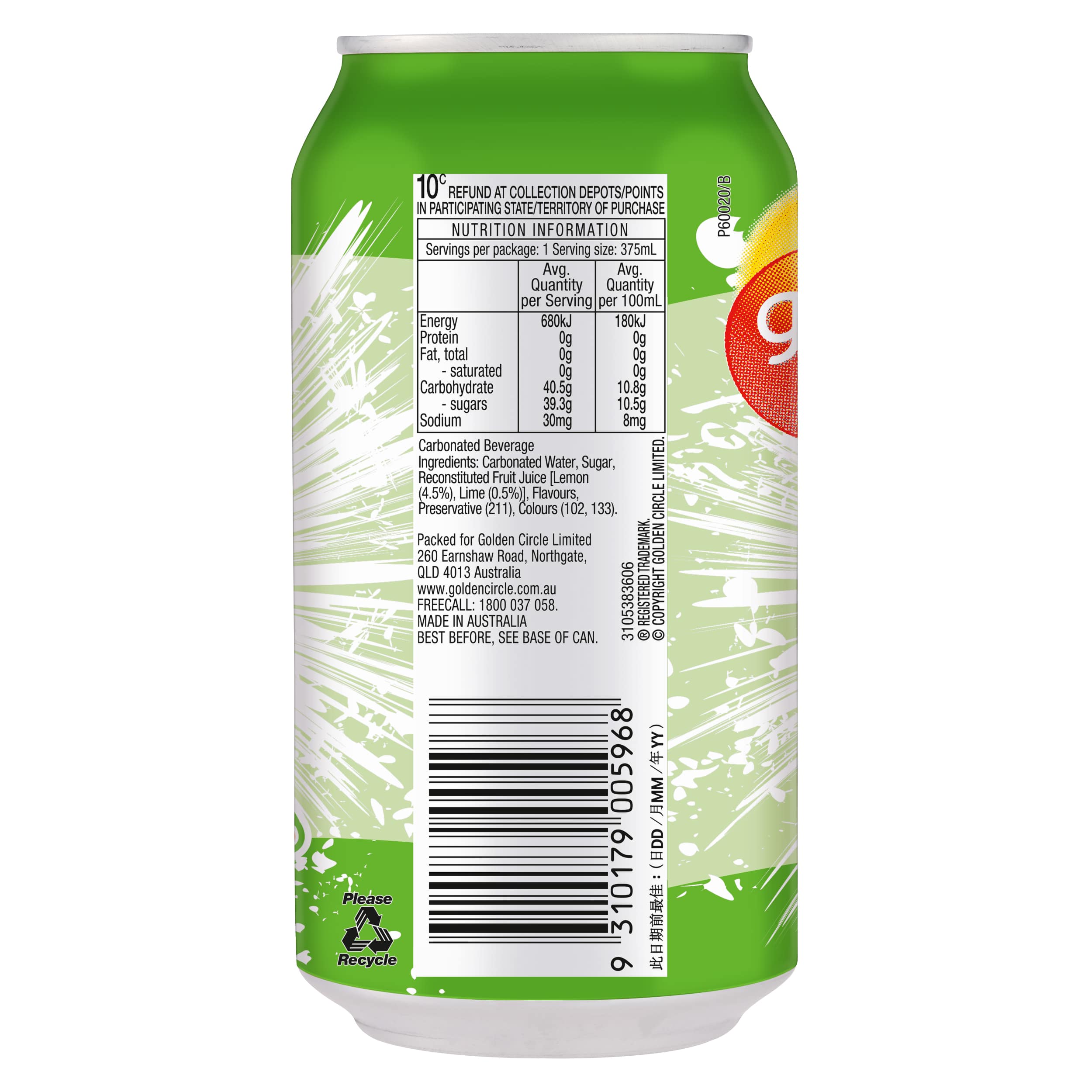 Enjoy a delicious combo of fruit flavours with Golden Circle® Lemon & Lime Soft Drink. Made with 5% fruit juice, it's perfect for taking to the beach, on picnics or to the park. Whether you want to cool down on a hot day, throw a little get-together with your friends or make meals extra special, Golden Circle® Lemon & Lime Soft Drink has you covered. It's deliciously sweet and sparkling, making it an excellent choice of drink when you feel like sipping on something cold. • A mix of lemon and lime flavours • Contains 5% fruit juice • Serve over ice with a wedge of lemon or lime • Great for beach days and picnics • 375mL canned format is perfect for on-the-go