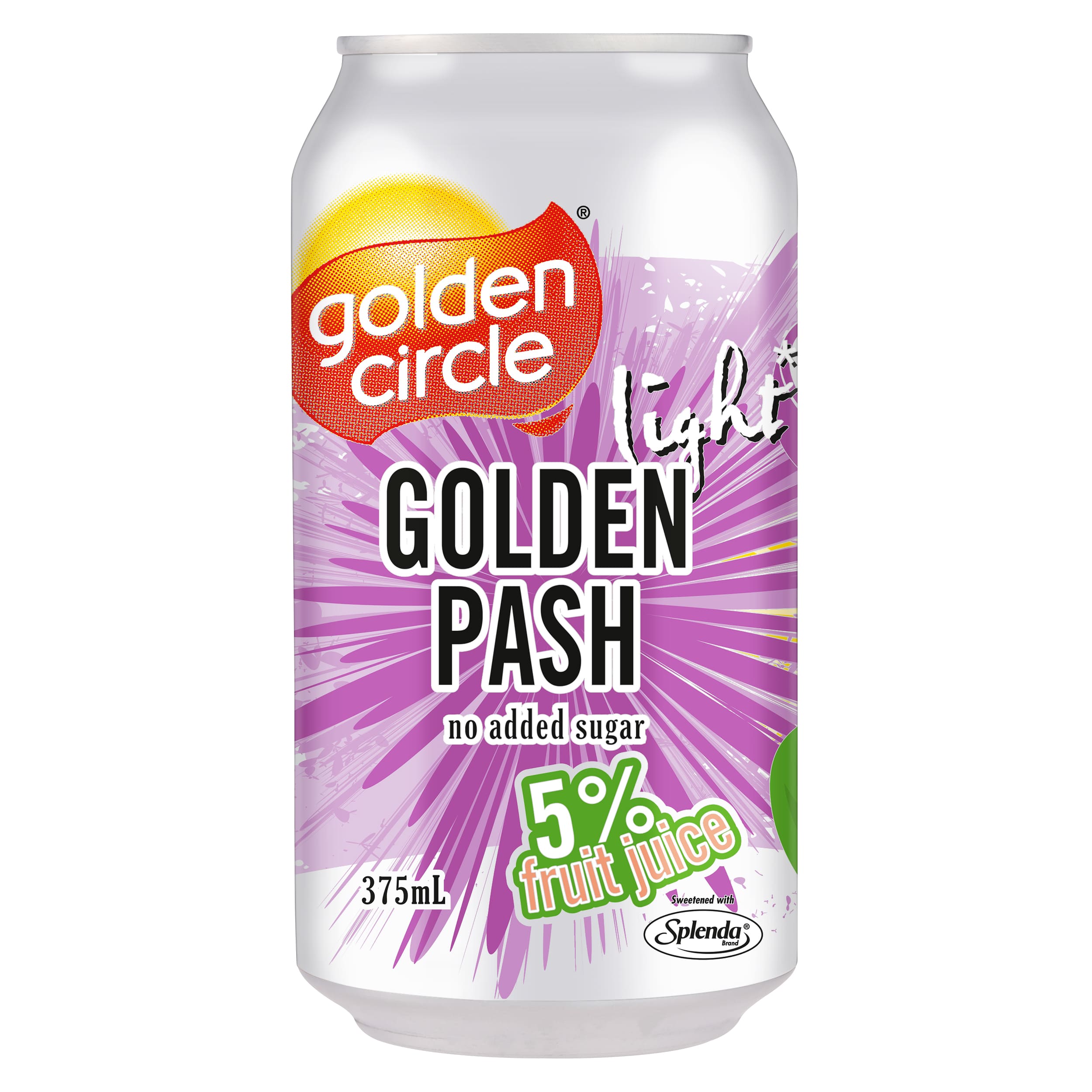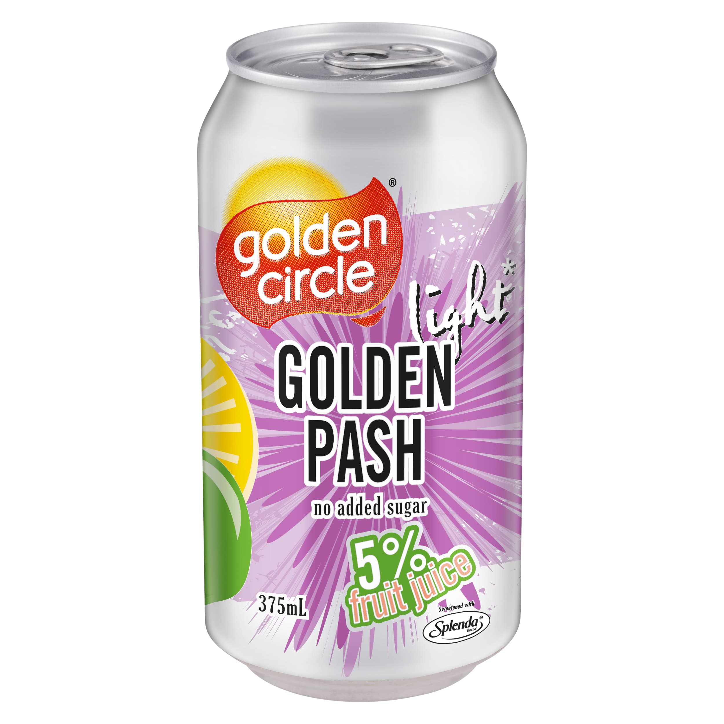 Golden Circle® Golden Pash Light* is made with no added sugar. This classic flavoured soft drink is sure to be a favourite treat for the whole family. Turn any event into something special with a can of Golden Circle® Golden Pash Light*. Made with 85% less energy than the Golden Circle® Carbonated Beverage range, this soft drink is perfect for barbecues, birthday parties and picnics. Serve over ice or mix with mineral water and frozen fruit for a tasty punch. • Contains no added sugar • Made with 5% fruit juice • Light (Contains at least 85% less energy than the Golden Circle® Carbonated Beverage range.) • Packed in a convenient 375mL can • Ideal for barbecues and parties