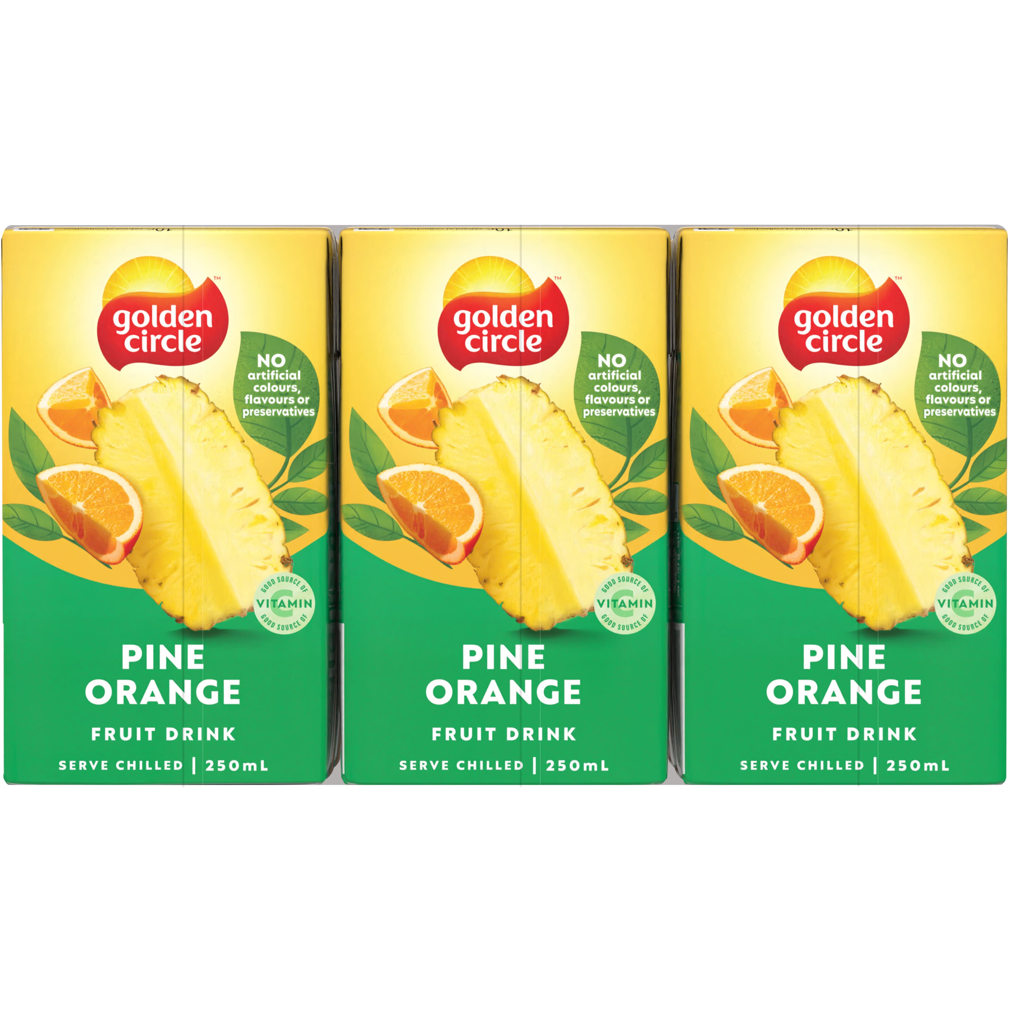 Golden Circle® Pine Orange Fruit Drink is made with no artificial colours, flavours or preservatives. This mix of pineapple and orange flavours is guaranteed to be your new summer favourite. Make sure you're stocked up with some Golden Circle® Pine Orange Fruit Drink this summer. Packed in single serves which are perfect for on the go too, whether you're heading to work, spending the day at the beach or going to a picnic in the park. Simply enjoy Golden Circle® Pine Orange Fruit Drink straight from the fridge. Golden Circle®, Share the Sunshine. • No artificial colours or flavours • Contains no preservatives • Enjoy while relaxing under the sun • Ideal size for serving at parties and barbecues