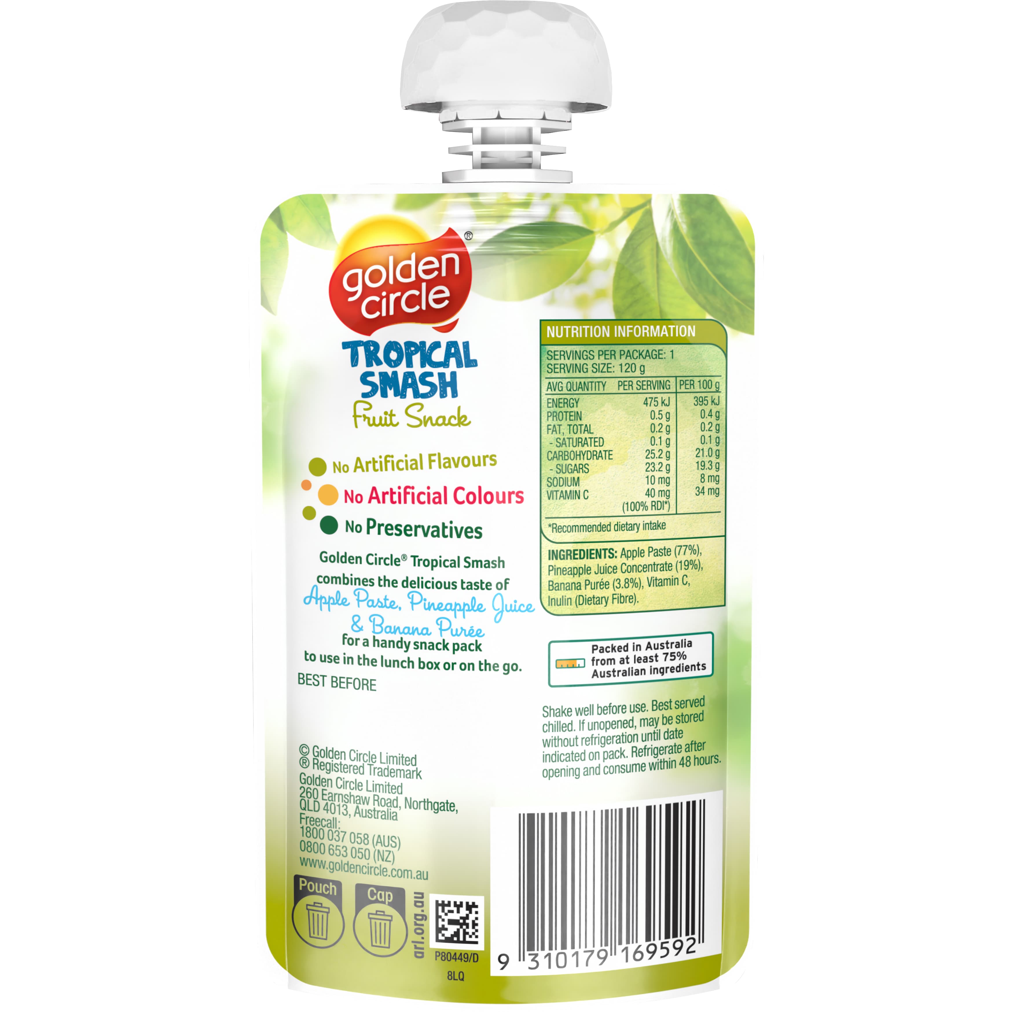 The delicious taste of apple, pineapple and banana with no artificial flavours or colours and no preservatives, Golden Circle® Tropical Smash Fruit...