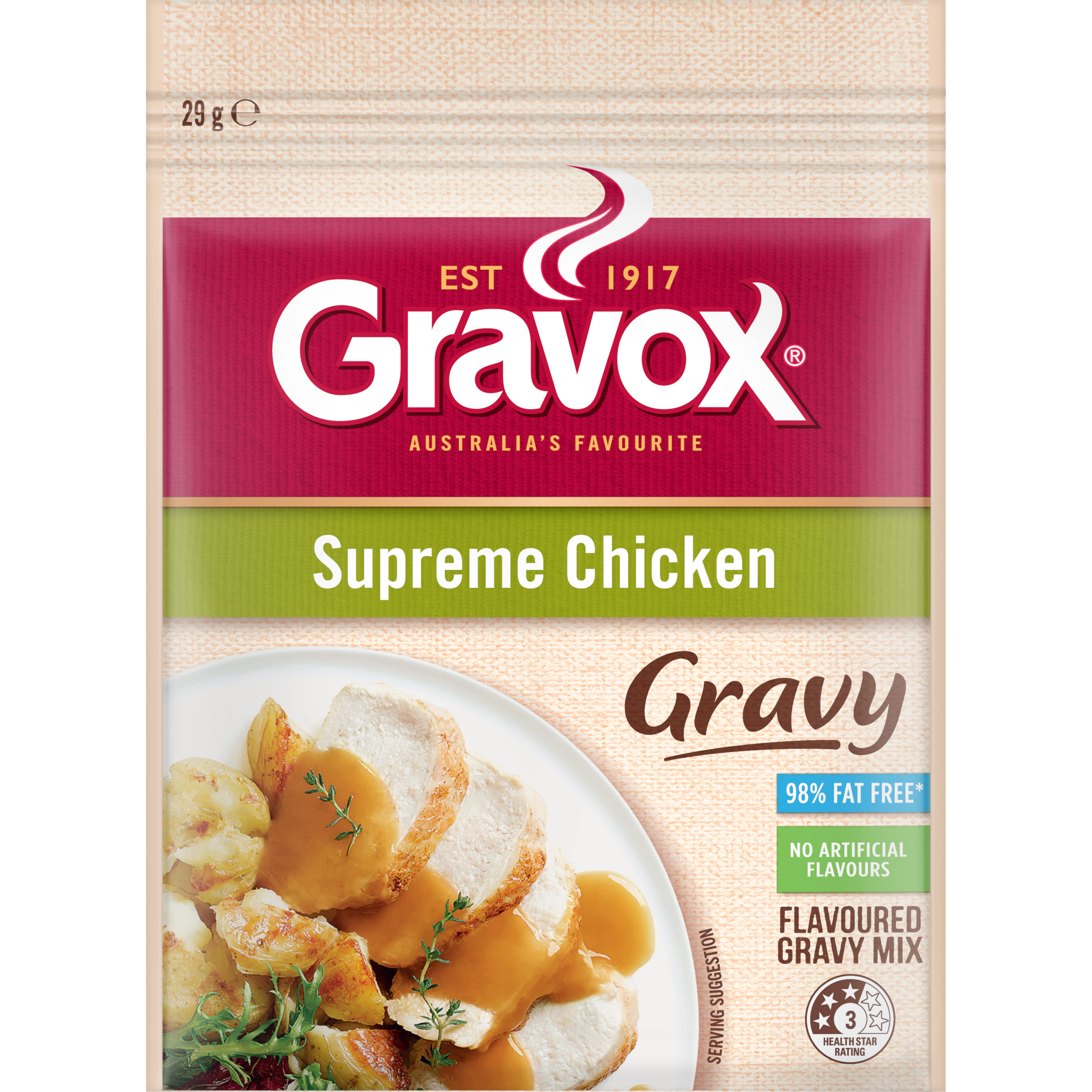 Add an extra pop of delicious chicken flavour to every roast dinner with Gravox® Supreme Chicken Flavoured Gravy Mix. This gravy is 98% fat free (when...