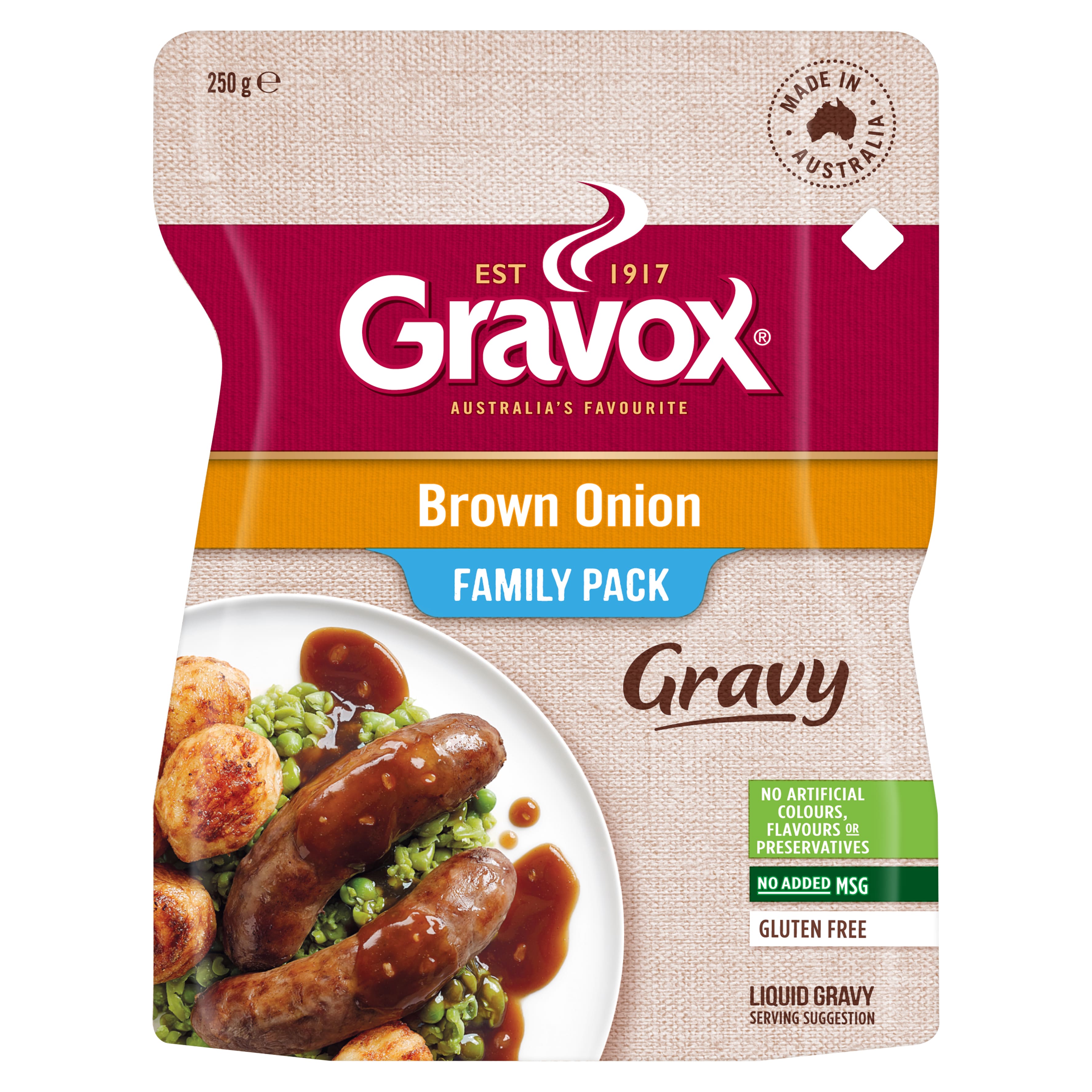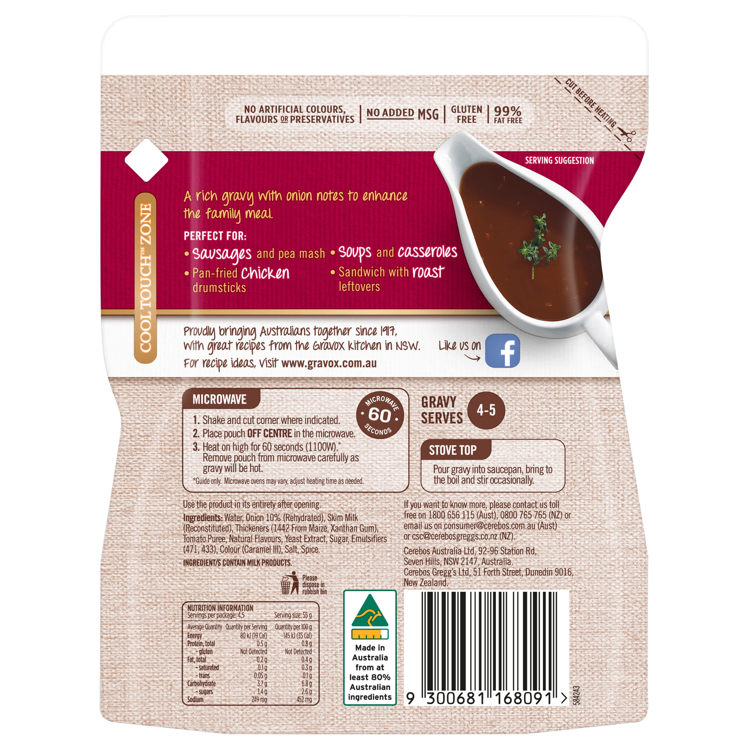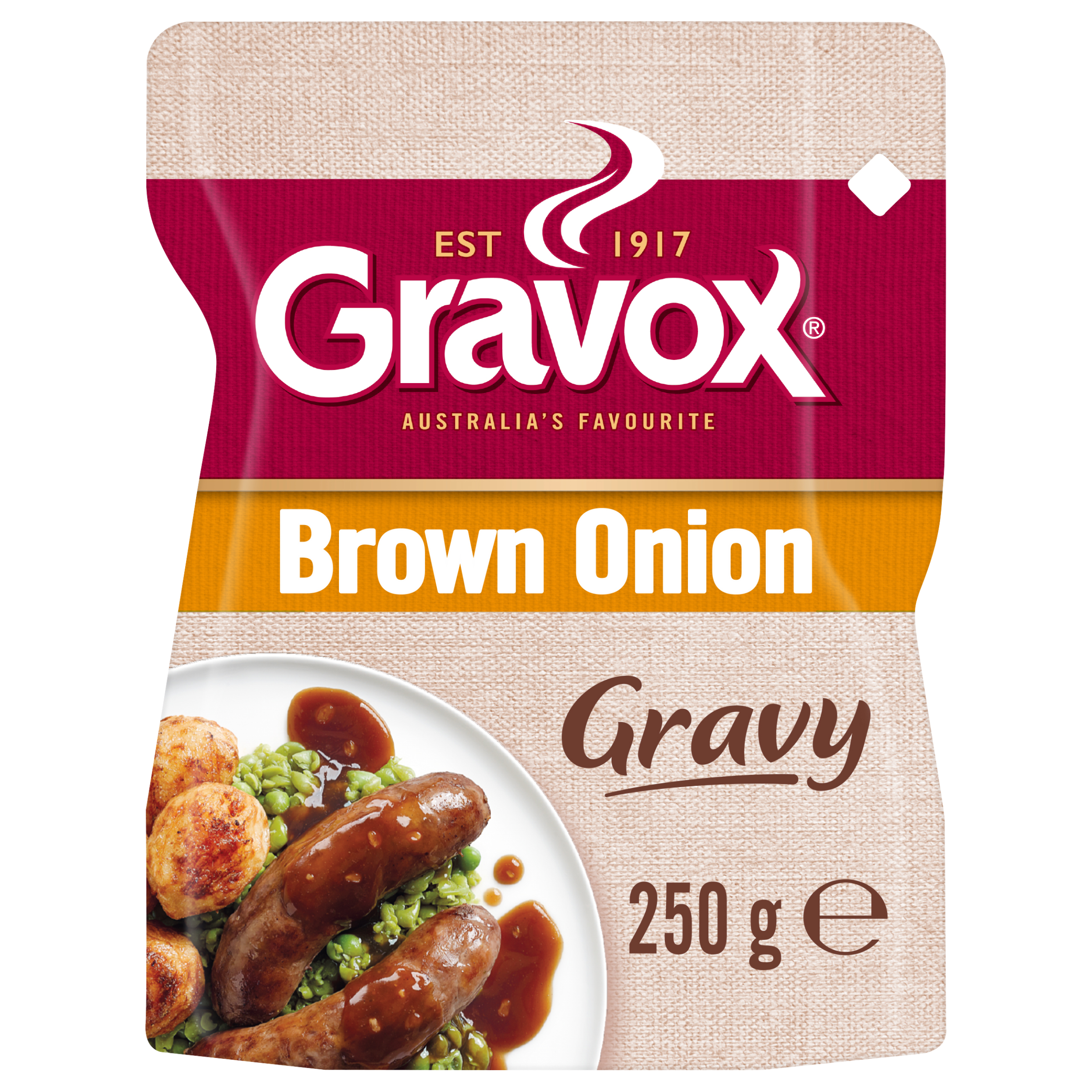 Bring some smiles to the dinner table with Gravox® Brown Onion Gravy. This classic gravy flavour is perfect with sausages, mash and peas and also tasty cooked into a steak pie. Gravox® Brown Onion Gravy is quick and easy to prepare, and contains no artificial colours, flavours or preservatives and no added MSG. Enjoy with sausages and mashed potato, as a stir fry sauce with mushrooms or with barbecued chicken. Gravox® Brown Onion Gravy is also gluten free and perfect for family mealtimes. • Contains no artificial colours, flavours or preservatives • Made with no added MSG • Gluten free • Perfect for bangers and mash • Also delicious with steak, pork chops and meatballs
