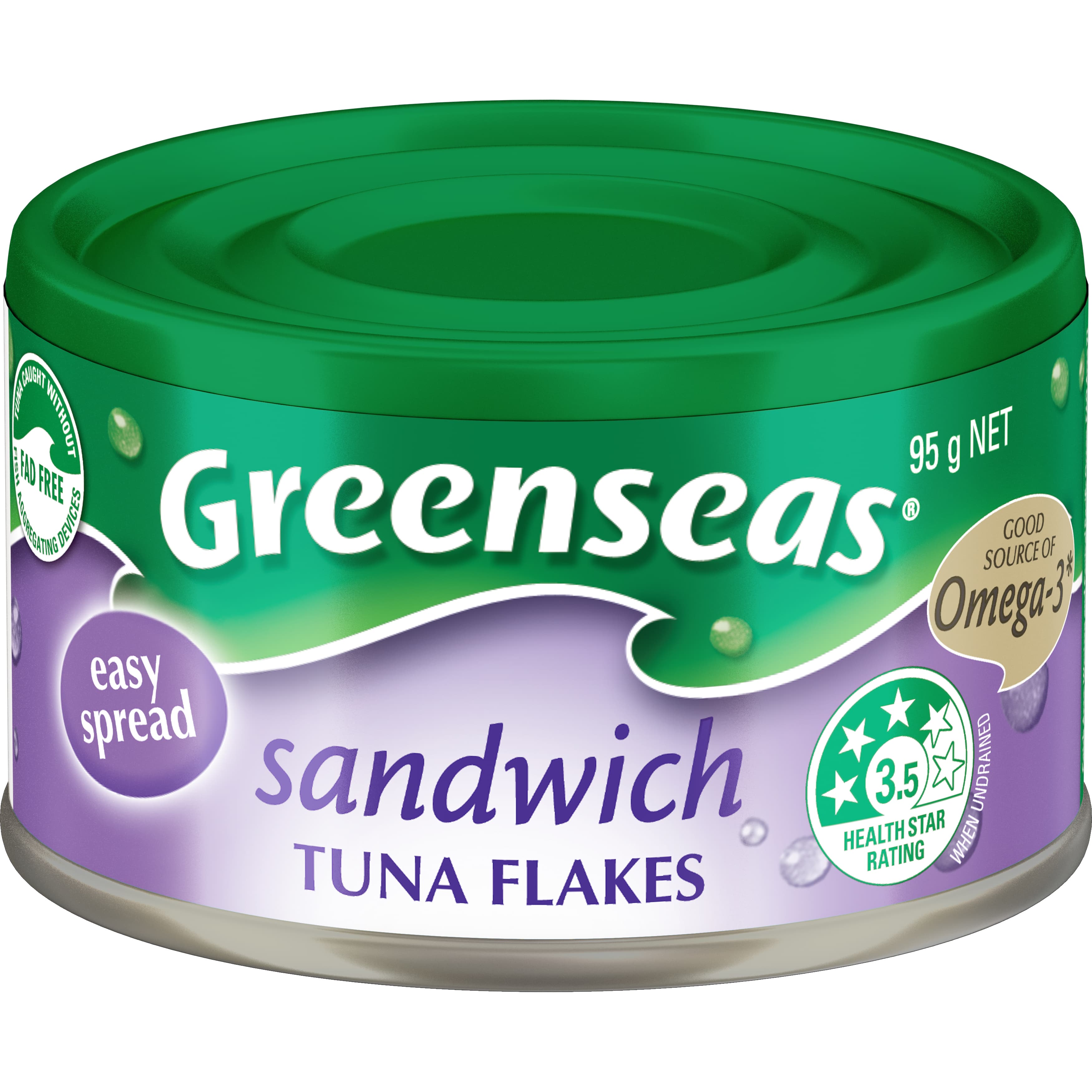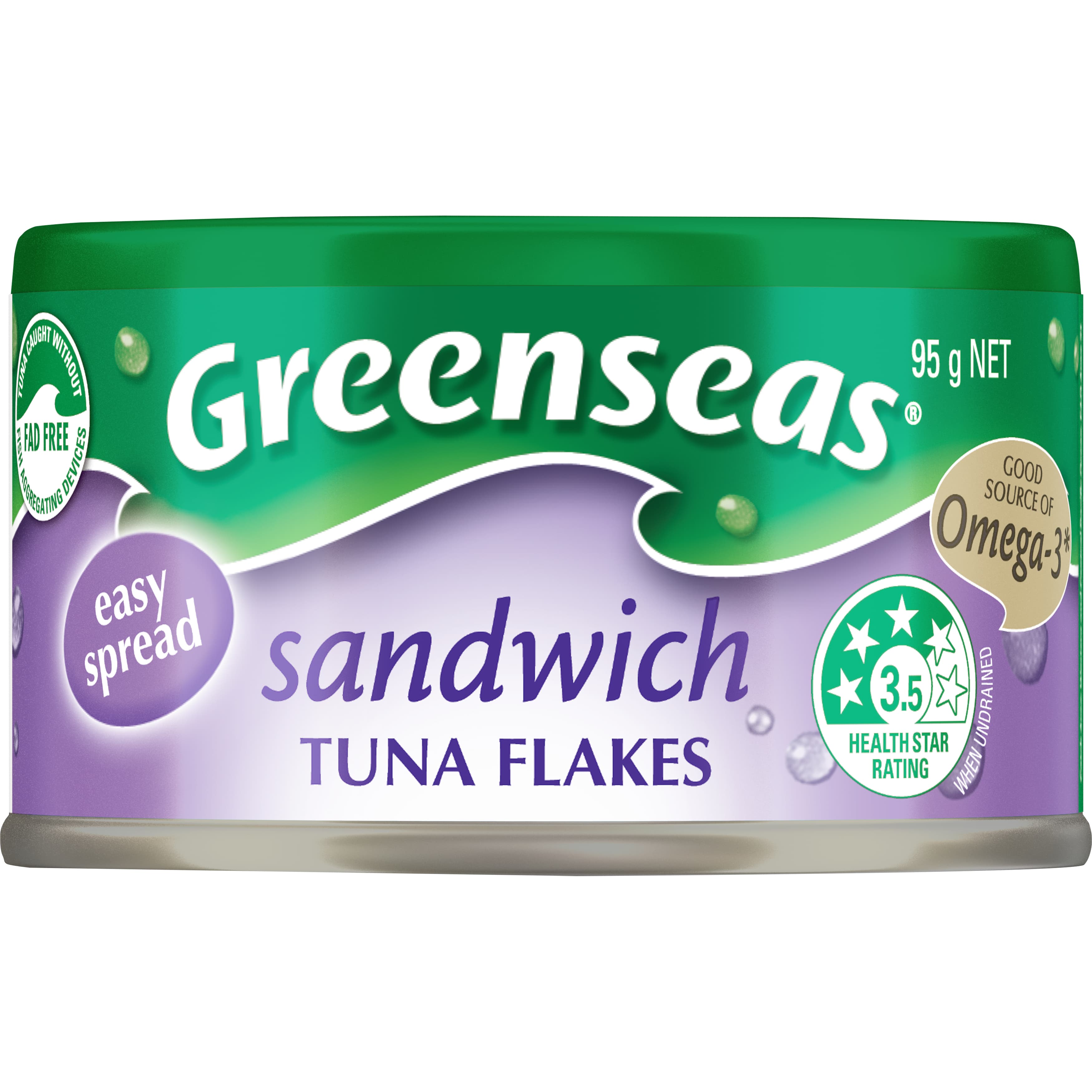 Designed for sandwiches, Greenseas® Sandwich Tuna Flakes are easy to spread. Keep your pantry stocked with these tuna flakes for an easy and delicious lunch at home or on the go. Make the perfect tuna sandwich or wrap with Greenseas® Sandwich Tuna Flakes. Simply spread our tuna flakes on sliced bread and add your favourite salad fillings for a delicious lunch at school, work or home. Greenseas® Sandwich Tuna Flakes provides a good source of Omega-3 (when drained). You can also try on toast as a tuna bruschetta. • Designed for sandwiches • Easy to spread • Good source of Omega-3 (When drained) • FAD free - caught without fish aggregating devices • Greenseas® Dolphin Safe