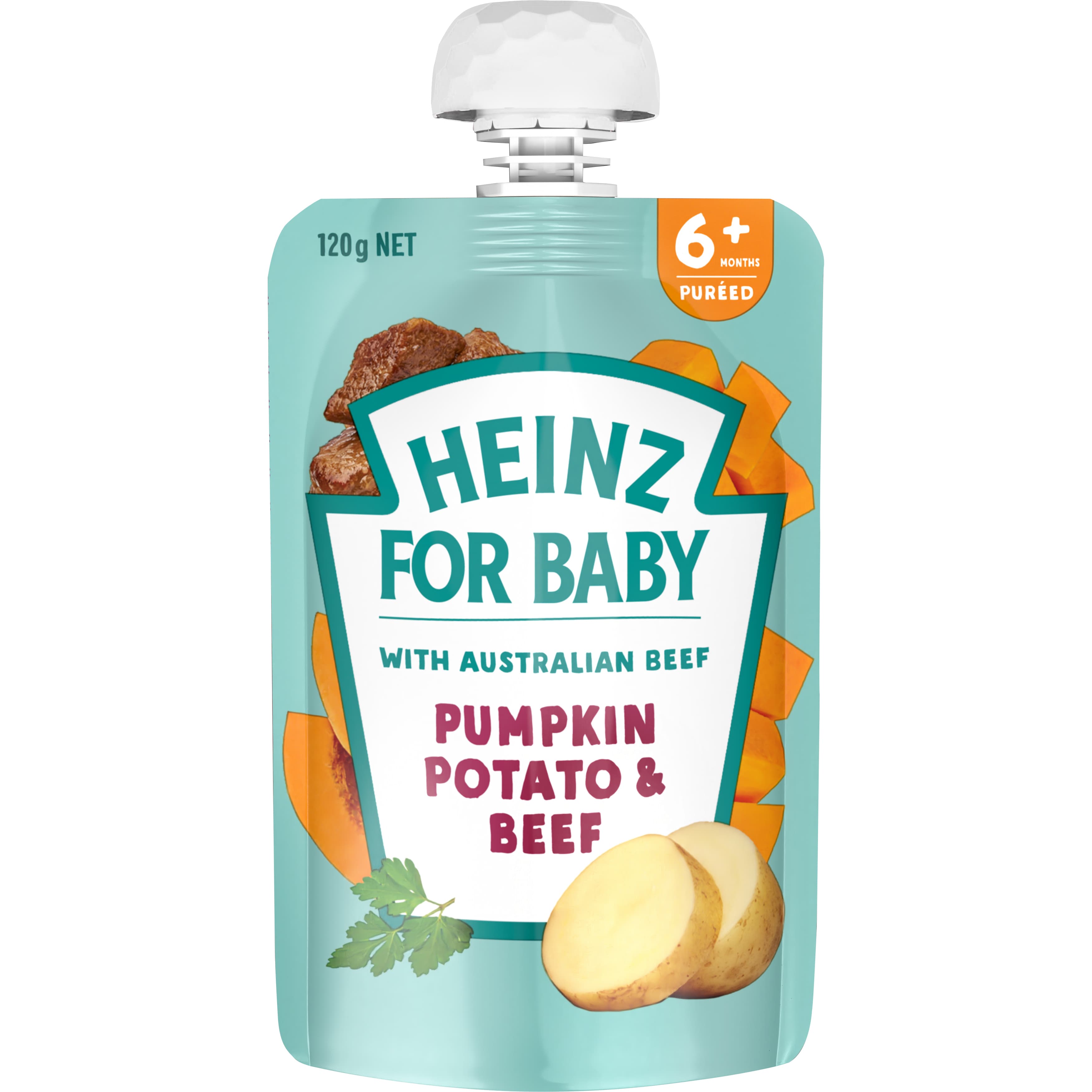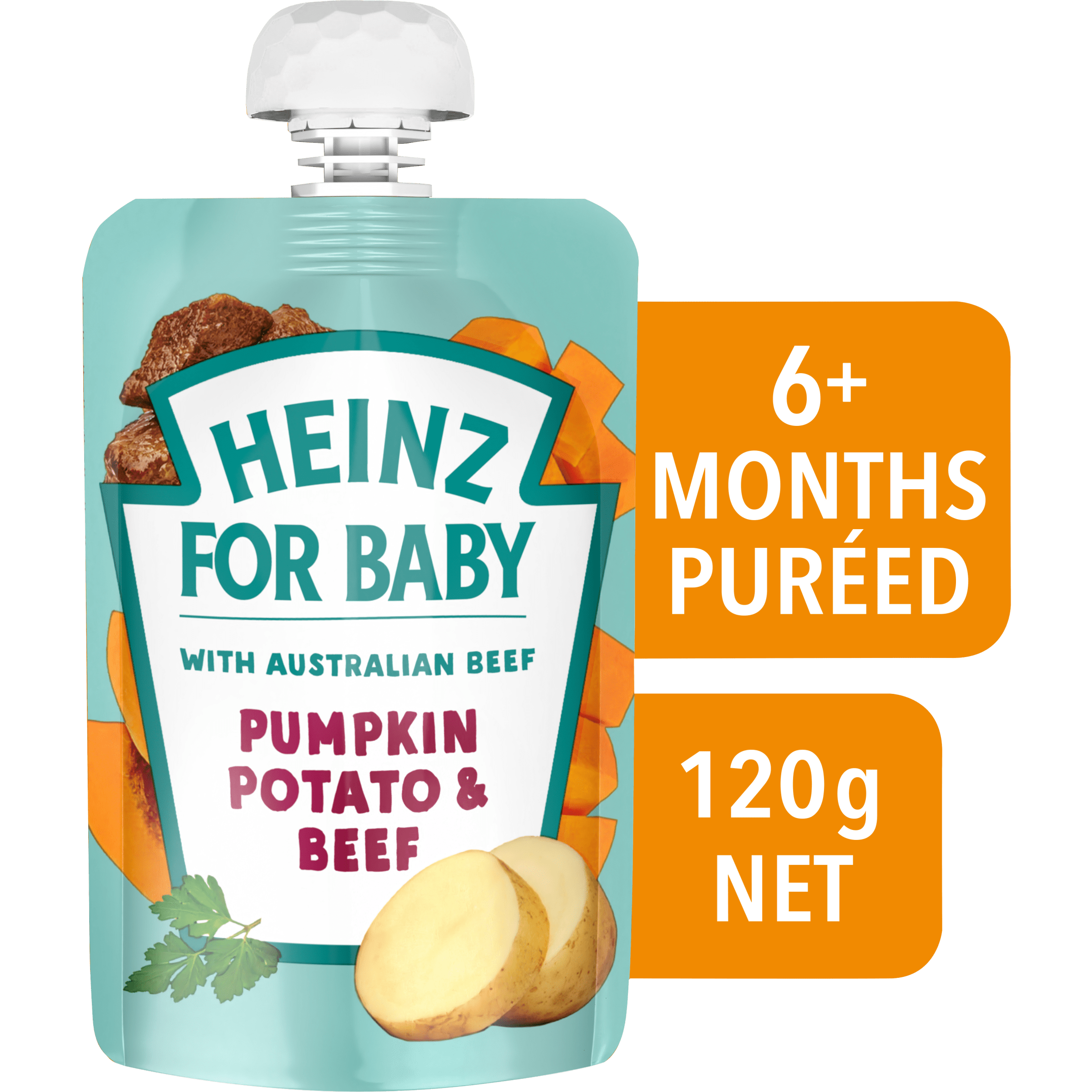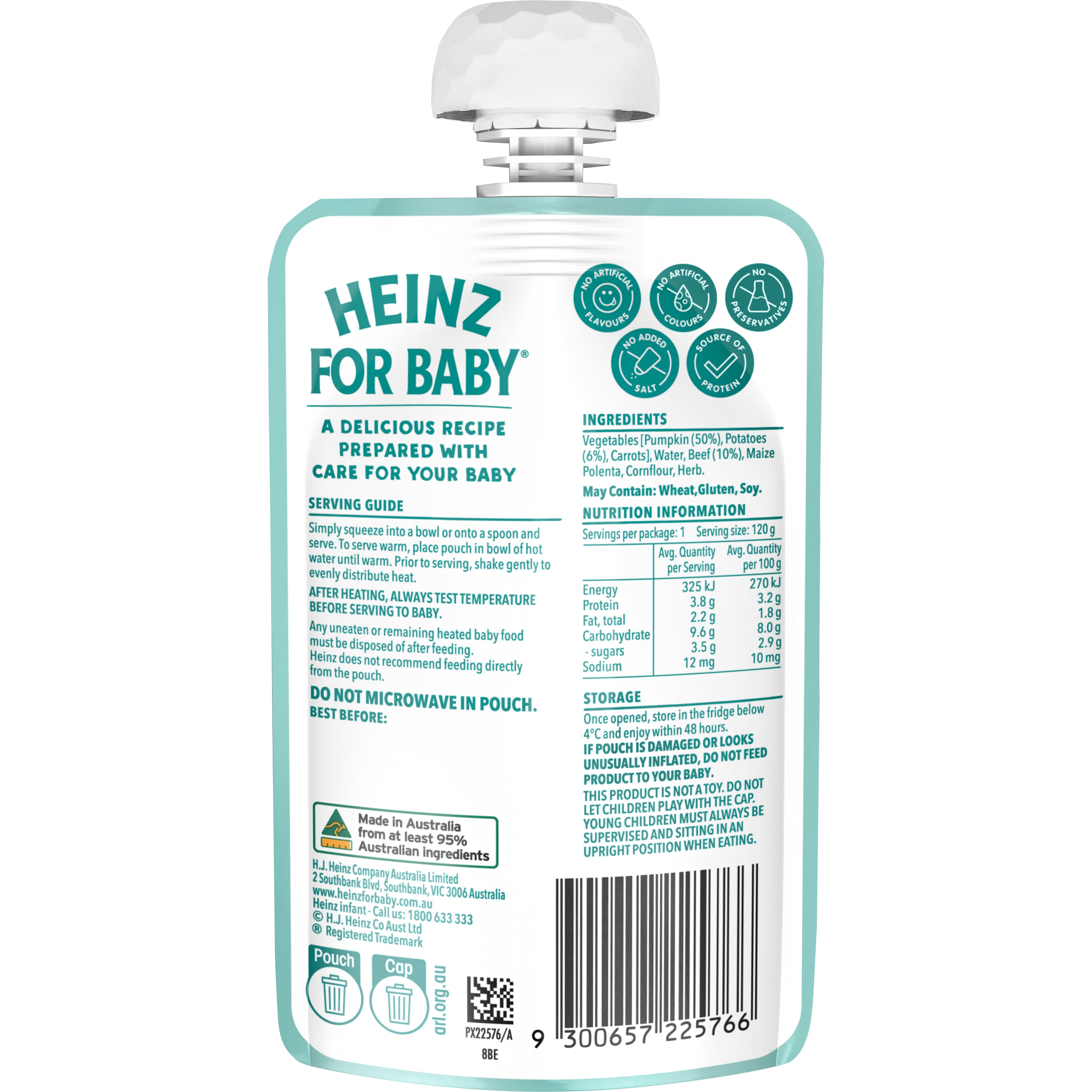 A delicious recipe prepared with pumpkin, potatoes, carrots, beef and polenta, Heinz for Baby® Pumpkin Potato & Beef is designed for ages 6+ months....