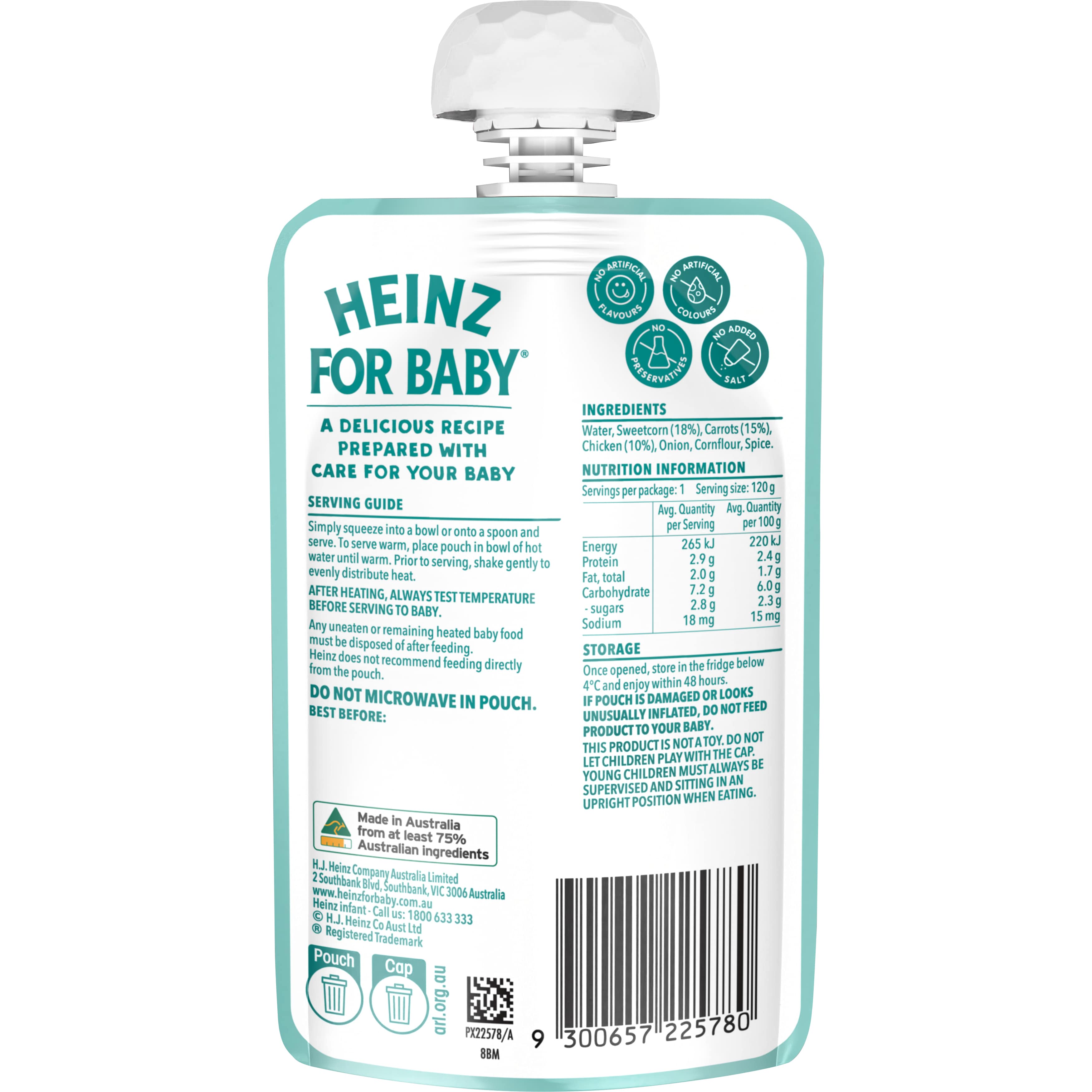 Introduce new flavour combinations to your baby aged 6+ months with Heinz for Baby® Golden Sweetcorn & Chicken. This puréed pouch is proudly made...