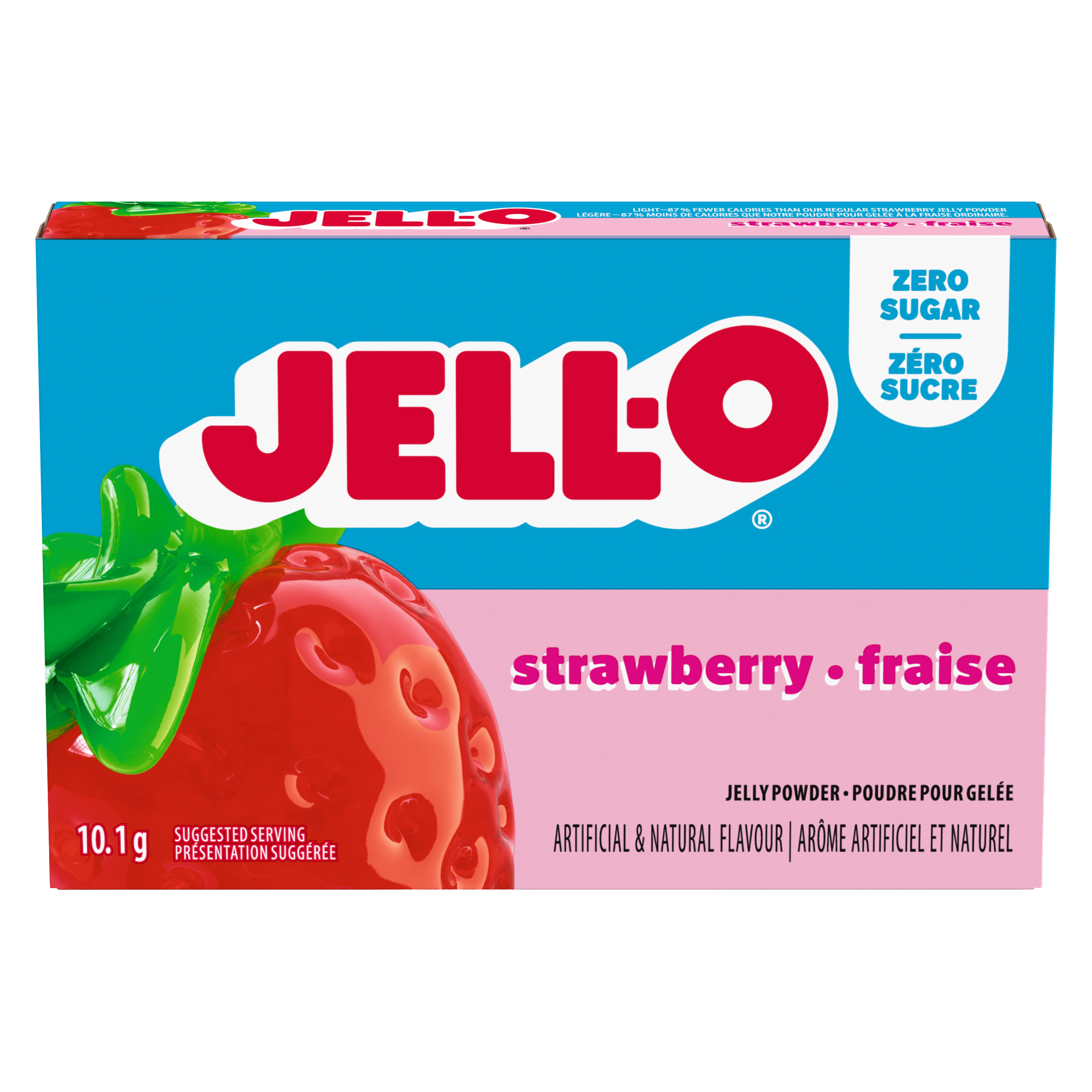 Snack happy. Jell-O Zero Sugar Strawberry Jelly Powder Mix lets you add some wonder to your day with a delicious snack. Spoon up a smile with our strawberry Jell-O that contains 0g of sugar and 10 calories per serving. Our colourful, jiggly treat is perfect for everyday snacking or special occasions with family and friends. Additionally, our jelly powder mix is a versatile ingredient for creating desserts like poke cakes, parfaits, pretzel salads, rainbow layer cakes and more. Our strawberry dessert is easy to prepare. Simply add 1 cup (250 mL) of boiling water to jelly powder and stir until completely dissolved. Next, stir in 1 cup (250 mL) of cold water or fruit juice and chill until set. Each Jell-O jelly powder mix is individually packaged in a 10.1 g sealed pouch and makes about 4 servings. Discover the timeless deliciousness of Jell-O gelatin.