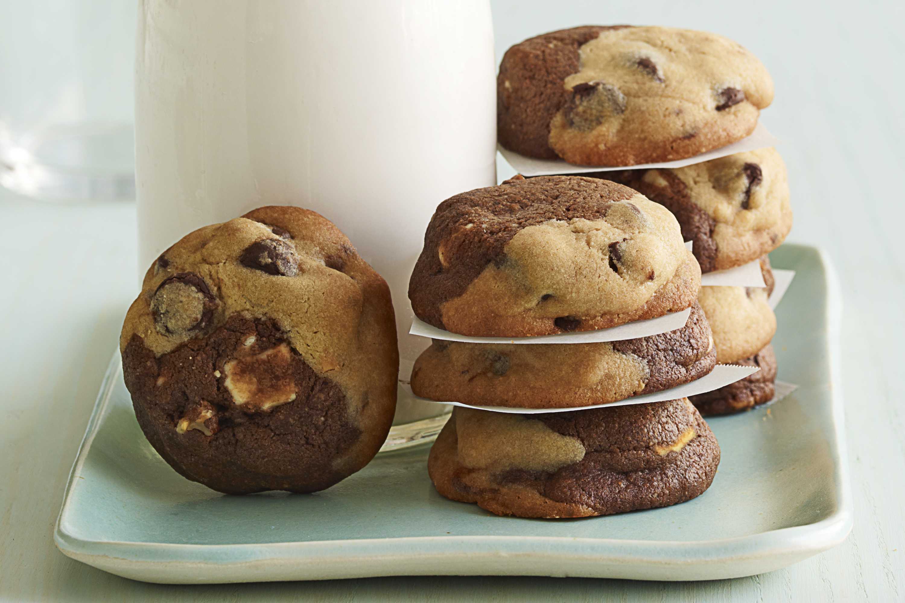 Divide dough in half; place in separate bowls. Add melted chocolate to dough in one bowl; mix well. Stir in white chocolate and nuts. Add peanut butter to dough in second bowl; mix well. Stir in chocolate chips.