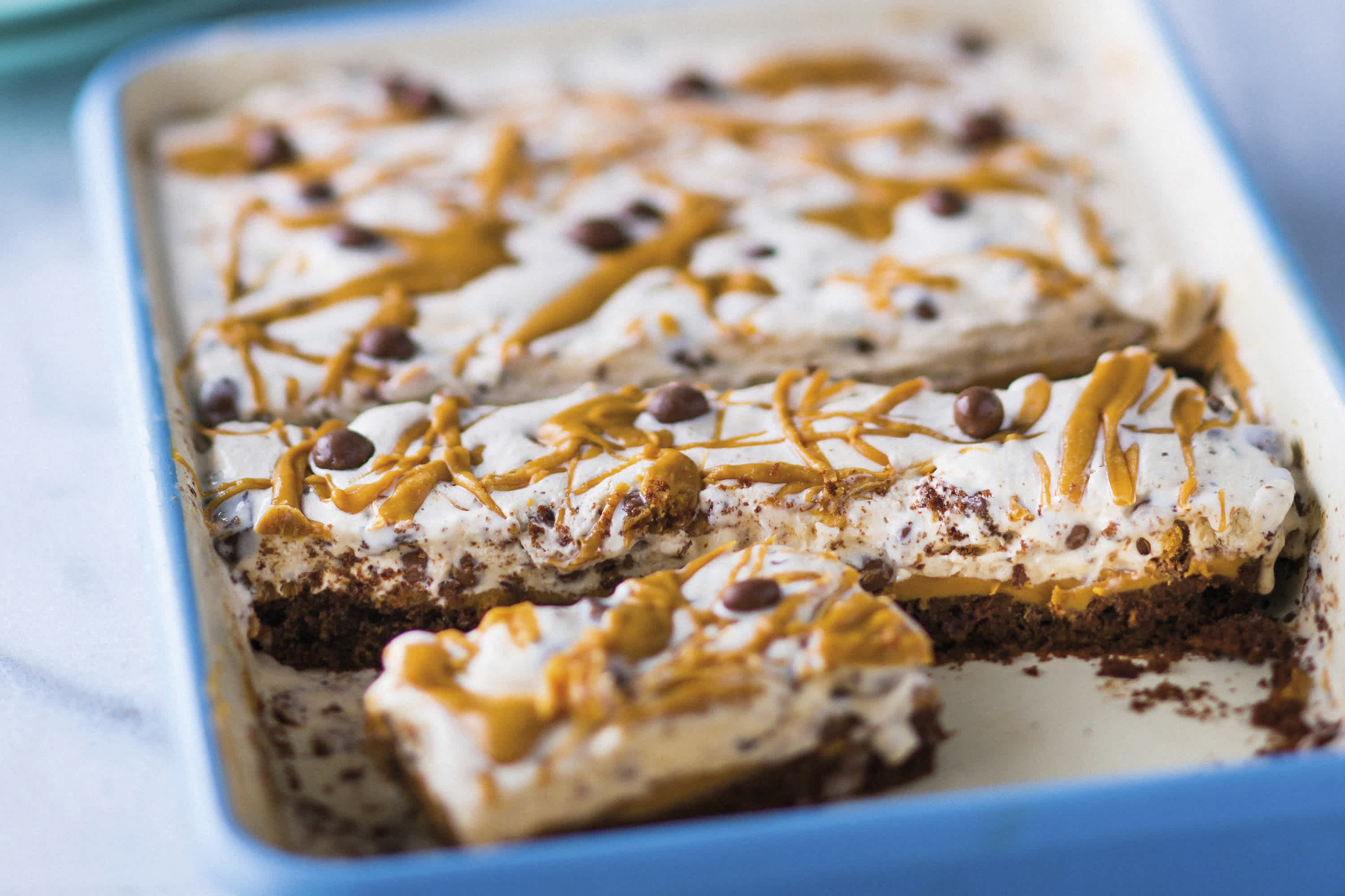 Spread 3/4 cup peanut butter onto brownie; cool. Refrigerate 30 min. Meanwhile, remove ice cream from freezer; let stand at room temperature until softened.