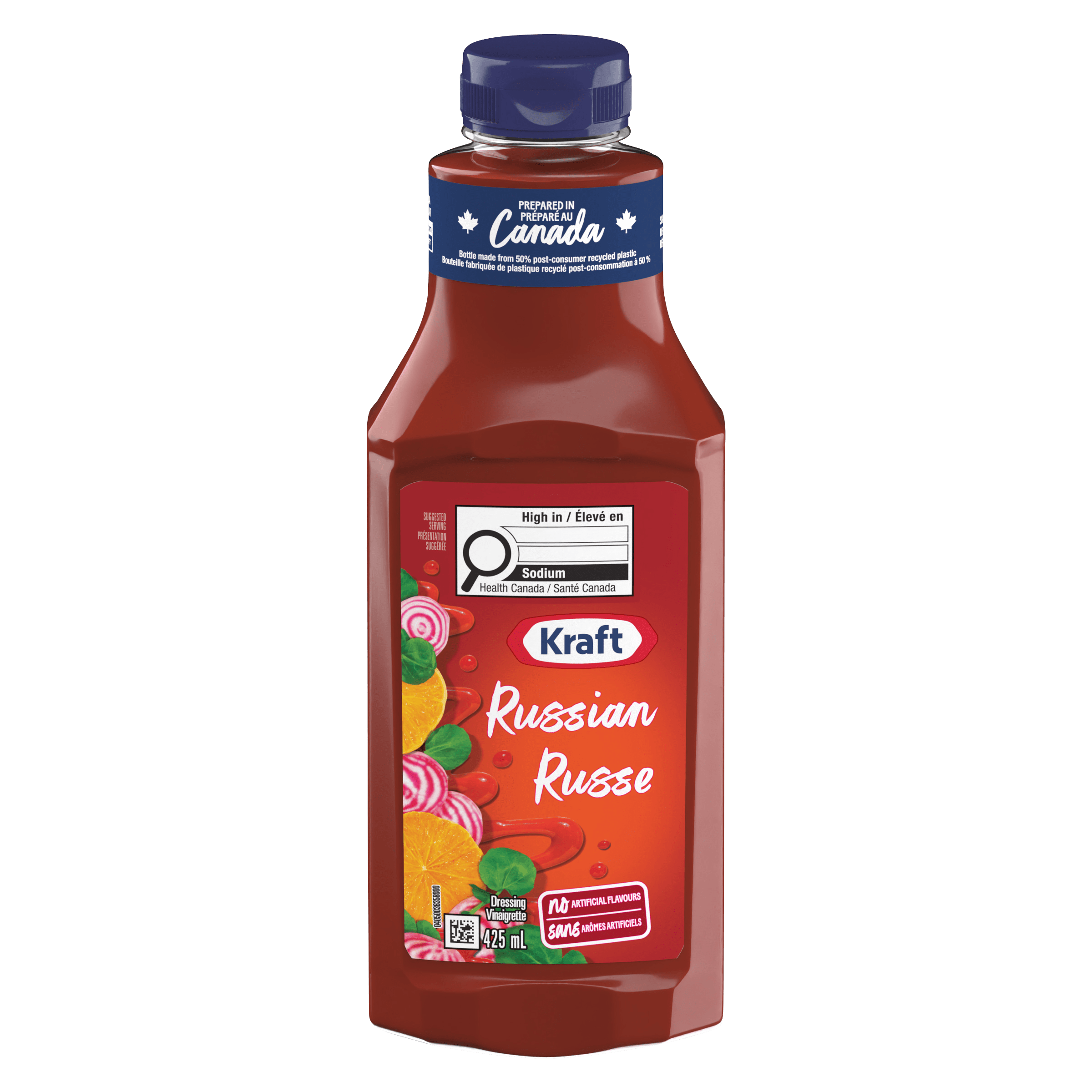 Create craveable salads and bowls with Kraft Russian Salad Dressing. Our delicious Russian dressing delivers bold flavour that transforms salads, sandwiches, wraps, bowls, pasta and more. Try our salad dressing as a marinade, dip or ingredient in your favourite recipes. Proudly prepared in Canada, our dressing is made with no artificial flavours. Each 425 mL bottle is made from 50% post-consumer recycled plastic. Simply add our dressing to elevate your salad and bowl creations.