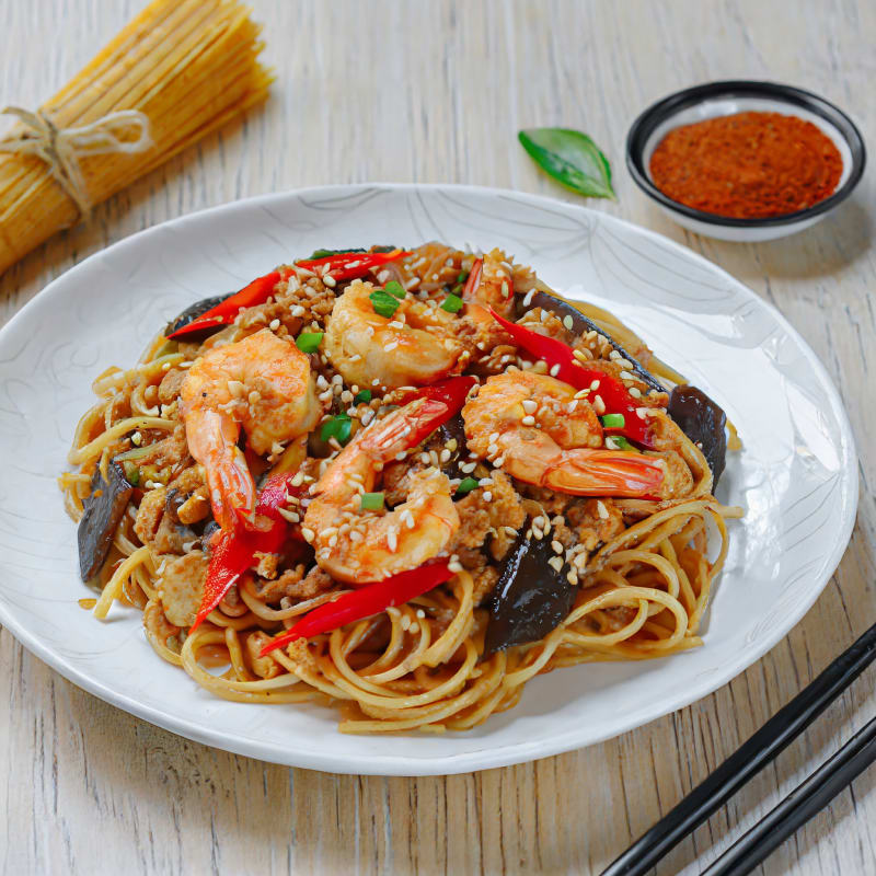 Spoon shrimp mixture to one side of skillet. Add soy sauce and peanut butter to other side of skillet; cook until peanut butter is completely melted and mixture is well blended, stirring frequently. Combine all ingredients in skillet; top with onions and sesame seed.