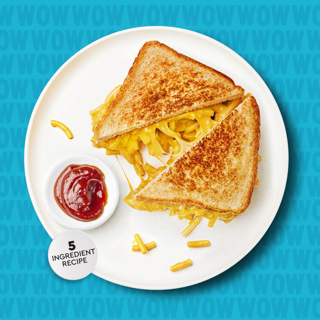 Top 1 bread slice with 1 Kraft Singles; cover with Kraft Dinner, remaining Singles and remaining bread slice.