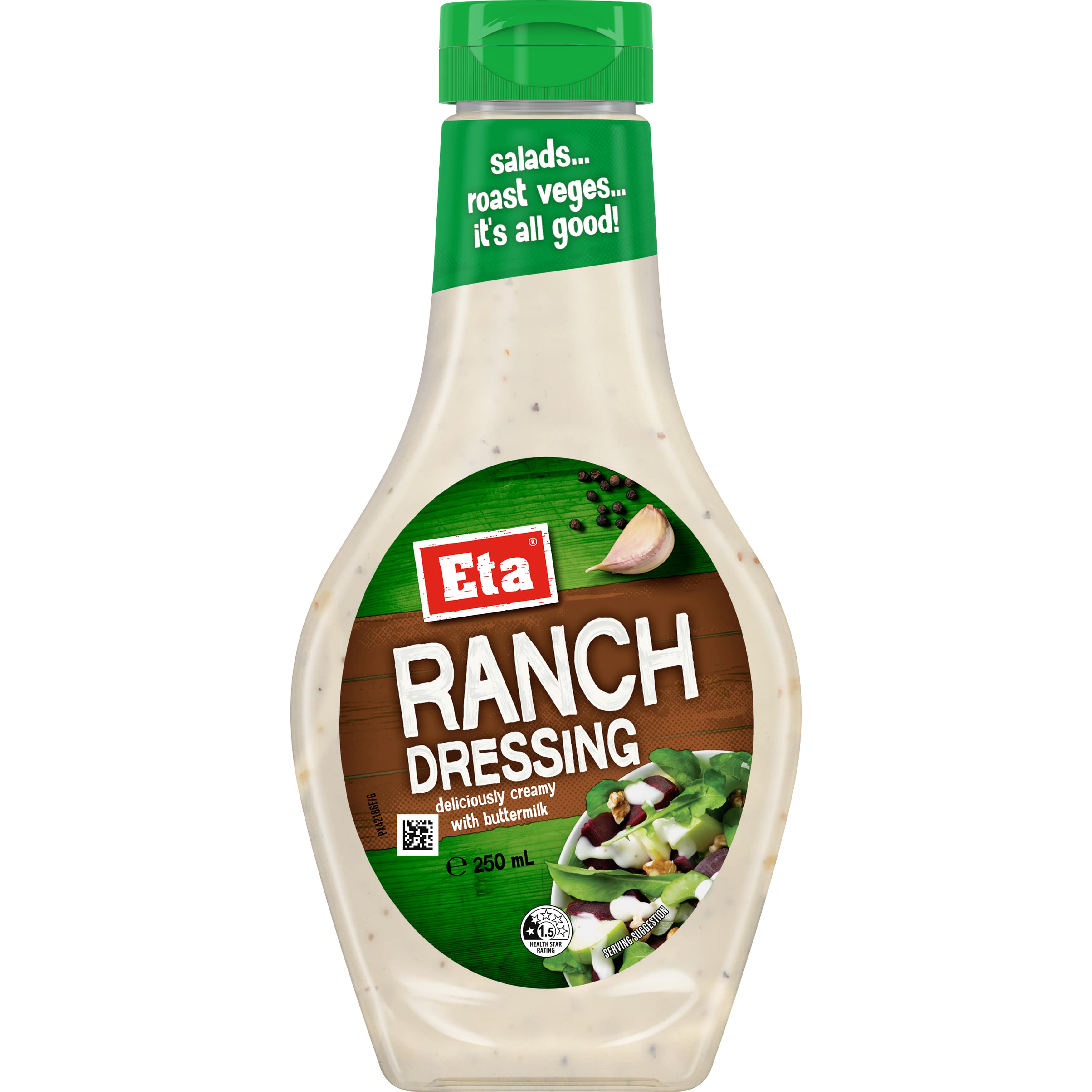 Creamy and versatile, Eta® Ranch Dressing is not just a tasty salad dressing. Toss through a cold pasta dish or use to flavour mashed potato. Flavour up your lunches with Eta® Ranch Dressing. Add to an avocado and chicken wrap, a loaded potato salad or use to make deviled eggs. • Creamy and versatile ranch dressing • Toss through pasta salads • Use to flavour mashed potato • Perfect with buffalo wings • Great dip for finger foods like fries and chicken nuggets