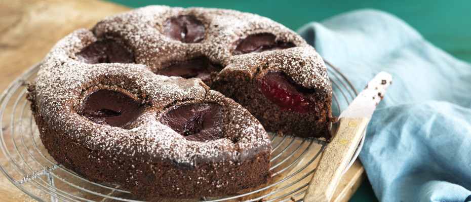 Chocolate, almond and plum cake
