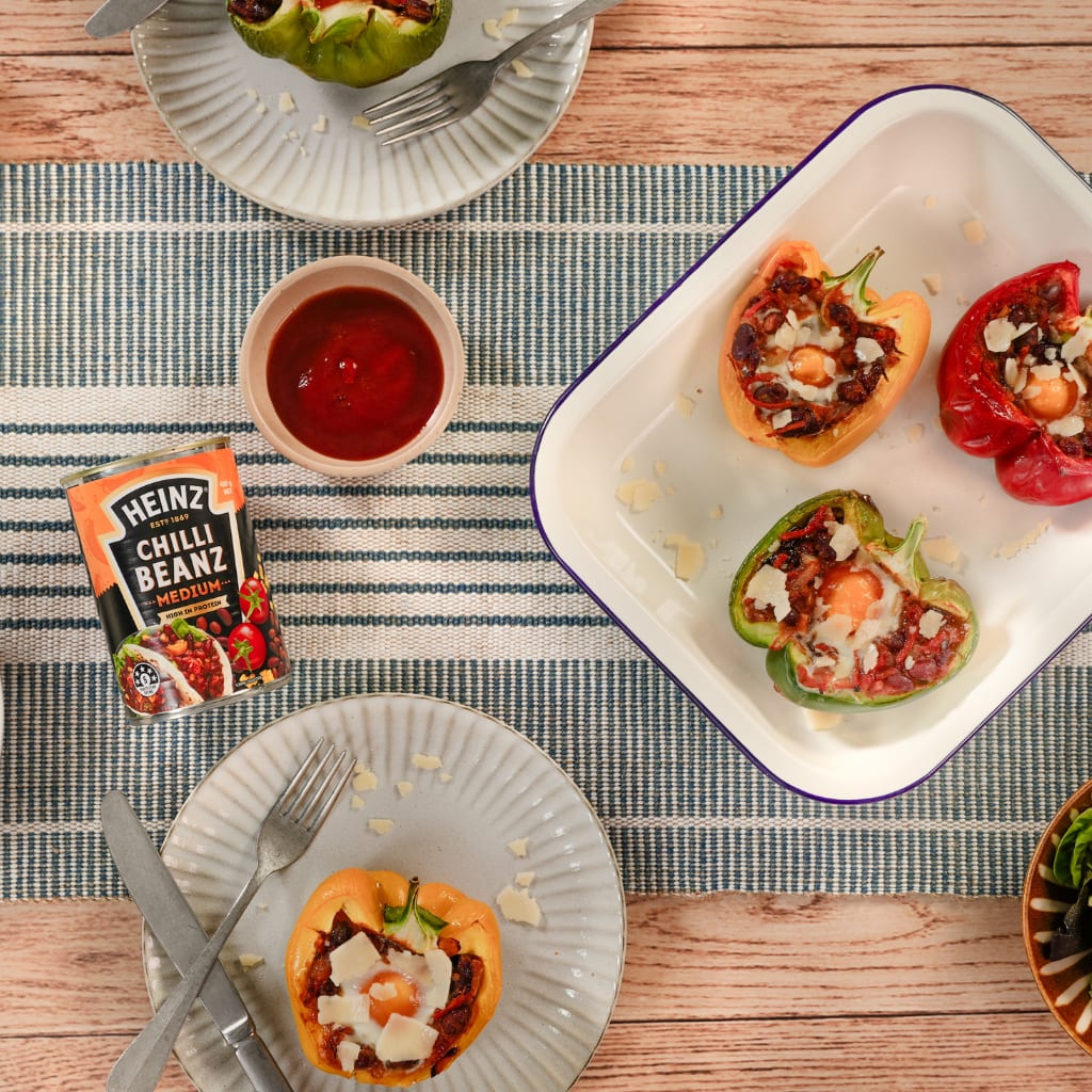Stuff each prepared capsicum with the bean mixture and place on a baking tray. Crack an egg on top of each capsicum half and sprinkle the remaining cheese on top.