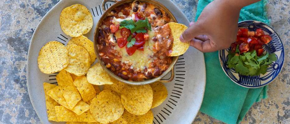 Stir through cream cheese and transfer to a serving bowl. Sprinkle over grated cheese, allowing it to melt. (If it doesn't melt put it in the microwave for 30 seconds*). Top with diced tomato. Garnish with fresh coriander leaves if wished. Serve with corn chips.
