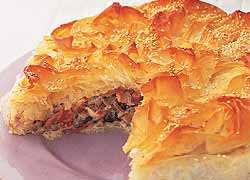 Brush 8 sheets of the filo pastry with butter or spray with oil and place into a 24 cm flan tin. Fill with the chicken and mushroom mixture and then flip the overhanging filo pastry edges into the centre.