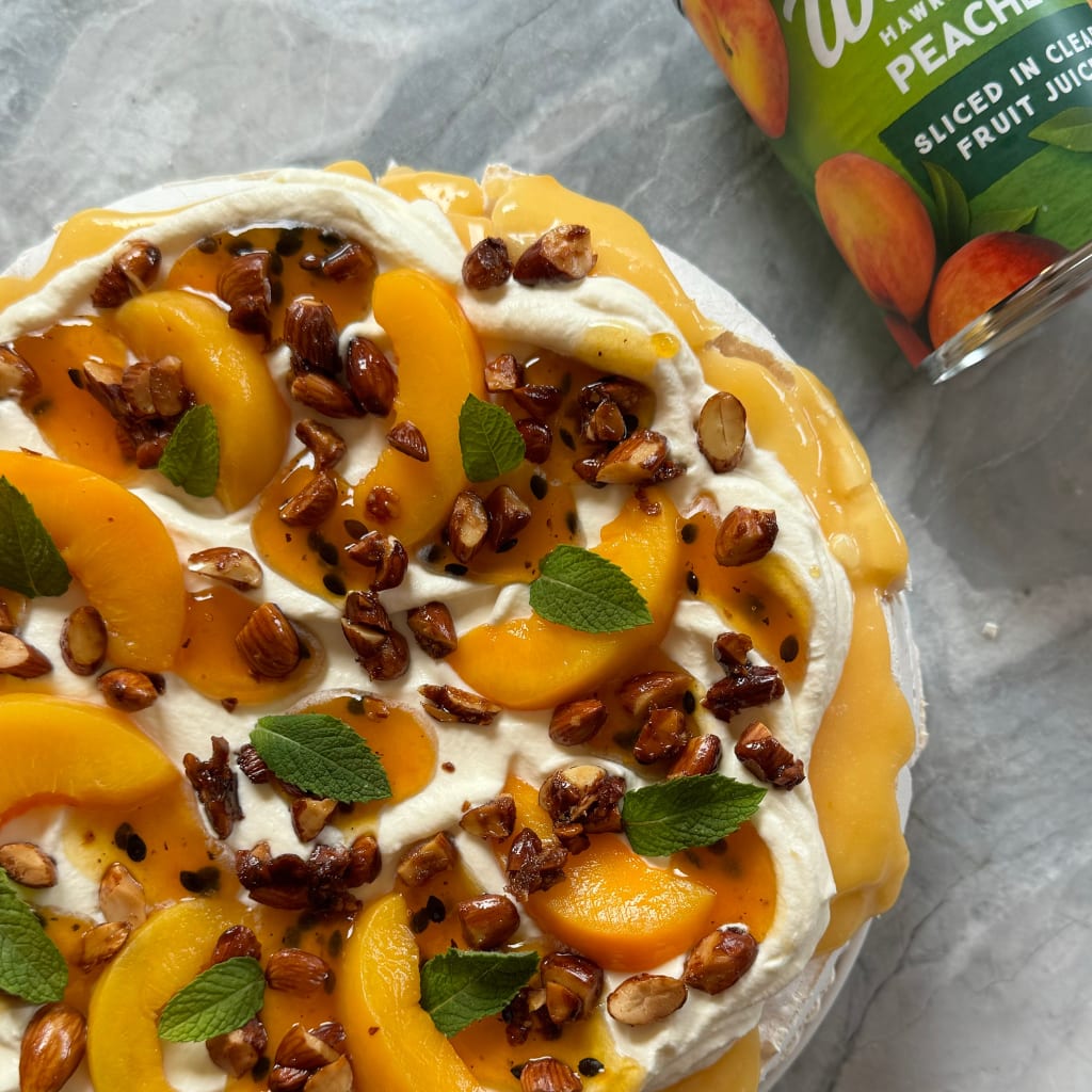 Grab a large bowl and add cream and vanilla essence. Whip until you reach firm peaks. Spread lemon curd over the pavlova, top with cream. Strain the peaches and then place the peaches on top of the cream, followed by passion fruit drizzle, caramelised nuts and fresh mint.