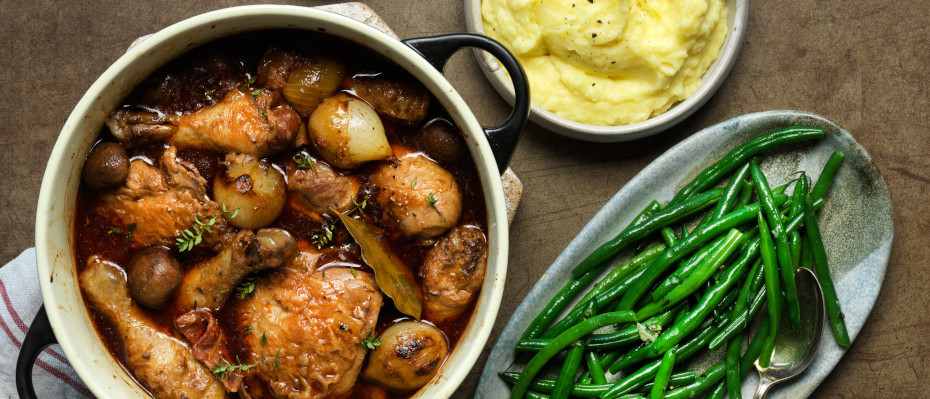 Dust the chicken pieces in the seasoned flour. Add a little extra oil to the pan if necessary and add the chicken. Saute over a medium heat until chicken colours. Return the onions and bacon to the dish. Pour over red wine and allow to boil until it reduces by half.