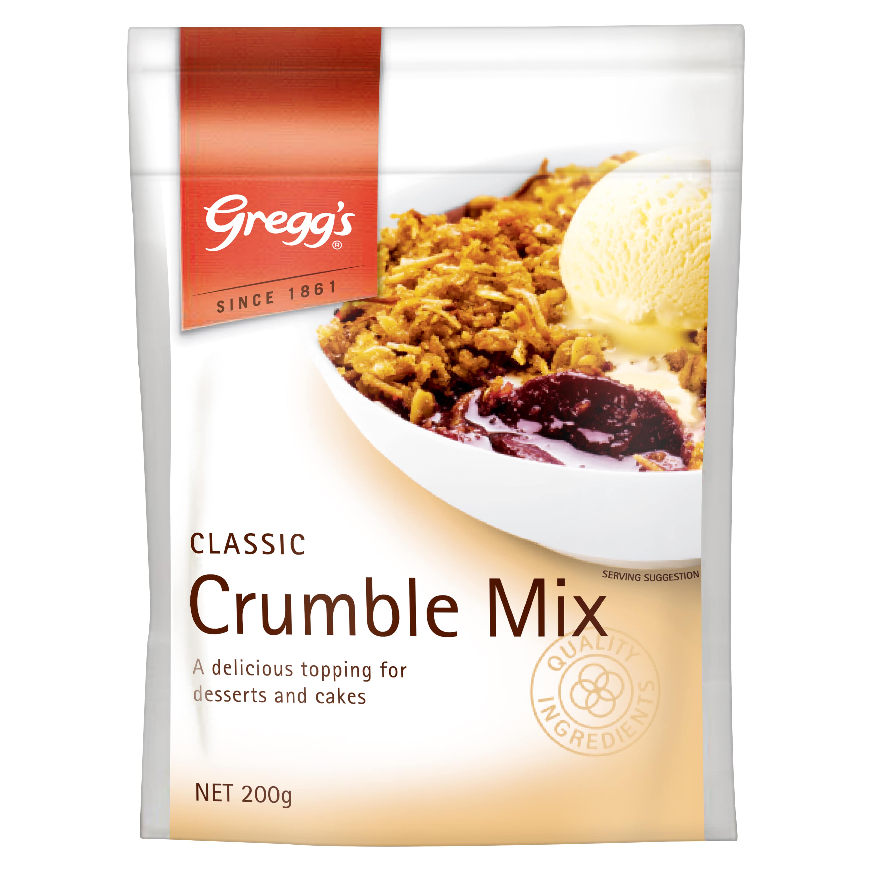 A fail-safe way to make a crispy dessert topping, Gregg's® Classic Crumble Mix pairs well with a variety of fruit desserts. Perfect for making apple crumble, plum crumble and other classics and just delicious sprinkled over muffins or coffee cakes. Gregg's® Classic Crumble Mix is the convenient way to create a crisp and delicious topping for cakes and fruit desserts. It comes in a resealable zip lock pouch for easy storage and pouring. Sprinkle generously over fresh or canned fruit of your choice and bake for about 25 minutes at 180° for a delicious fruit crumble dessert. • Topping for desserts and cakes • Delicious over fruit • Classic crumble mix • Resealable zip packaging • Quality ingredients