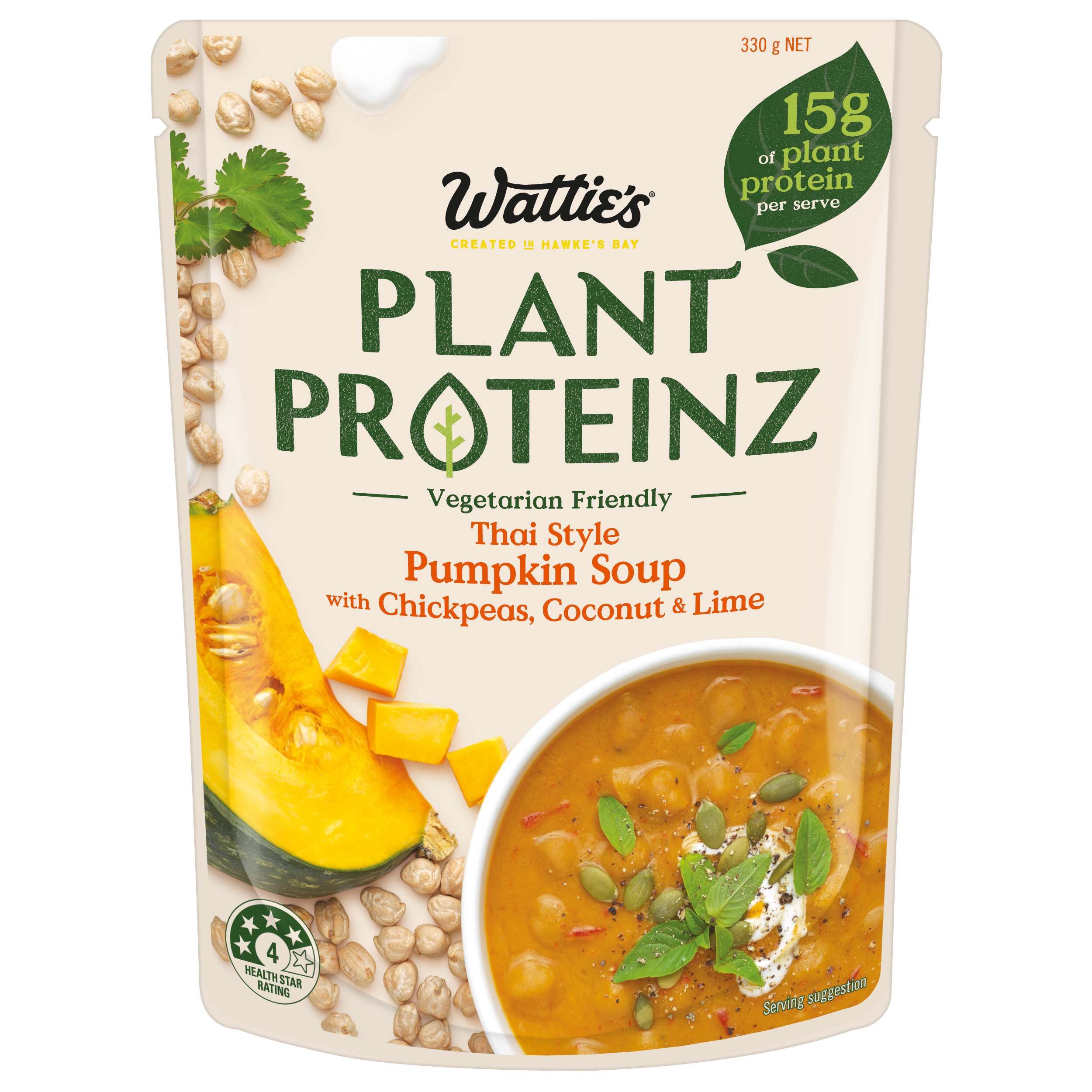 Enjoy a spicy take on a classic soup with Wattie's® Plant Proteinz™ Thai Style Pumpkin Soup with Chickpeas, Coconut & Lime. With 15g of plant protein per serve, this soup is great for busy days. Wattie's® Plant Proteinz™ Thai Style Pumpkin Soup with Chickpeas, Coconut & Lime is an excellent source of dietary fibre and contains no artificial colours or flavours and no preservatives. It's packed in a convenient pouch that is easy to grab for work or on the go - and it's simple to heat in a microwaveable bowl too. Top with a swirl of coconut cream and your favourite fresh herbs. • Vegetarian friendly • No artificial colours or flavours • No preservatives • Excellent source of dietary fibre • 15g of plant protein per serve