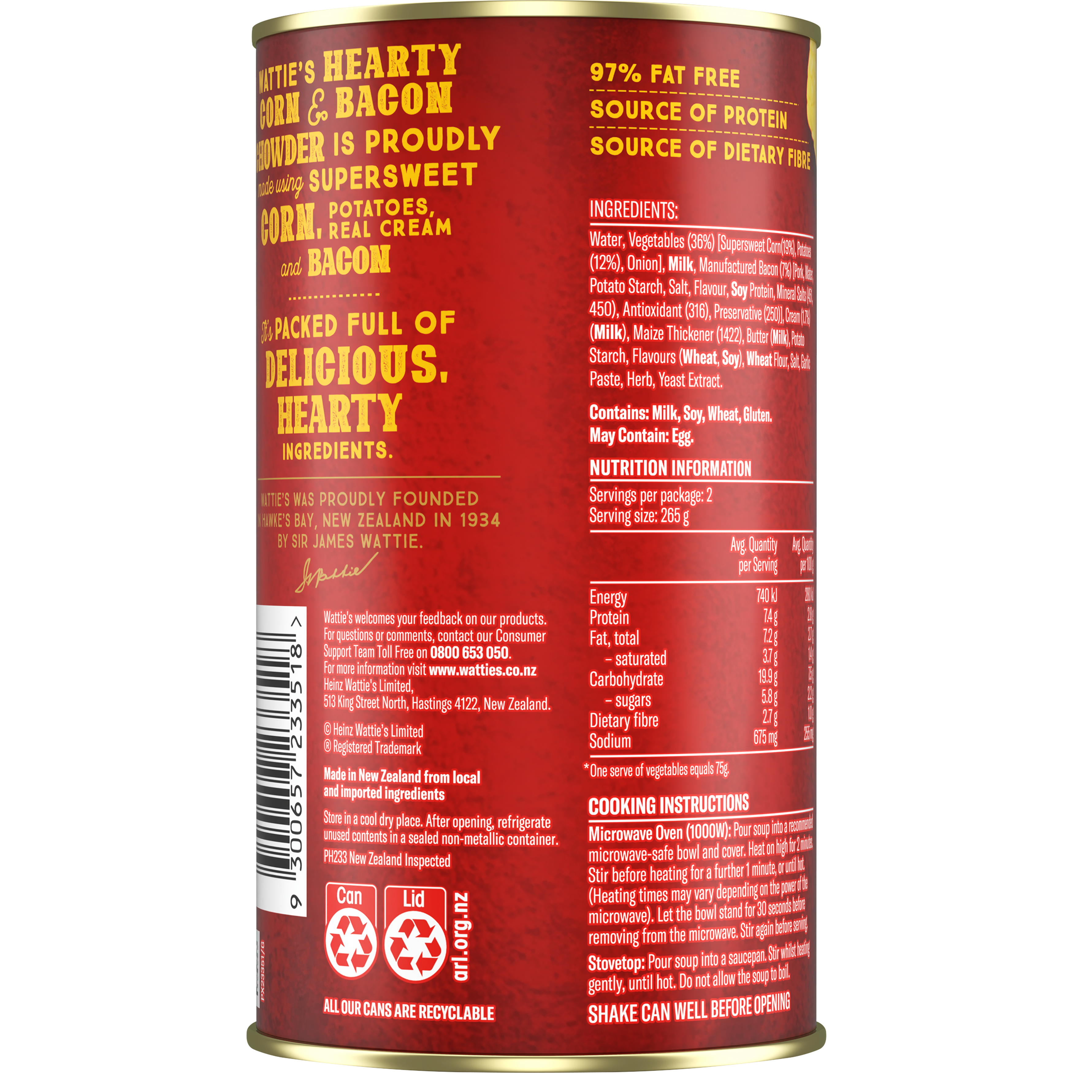 Packed full of hearty ingredients including supersweet corn, potatoes, real cream and bacon, Wattie's® Hearty Soup Corn & Bacon Chowder is a delicious soup for lunch or dinner that's 97% fat free. A hearty soup designed to be enjoyed on any day of the week, Wattie's® Hearty Soup Corn & Bacon Chowder provides a source of dietary fibre and protein. Serve with fresh, buttered crusty bread and a sprinkle of fresh herbs. • 2 serves of vegetables per can* (One serve of vegetables equals 75g.) • 97% fat free • Source of protein • Source of dietary fibre • Great for lunch or dinner