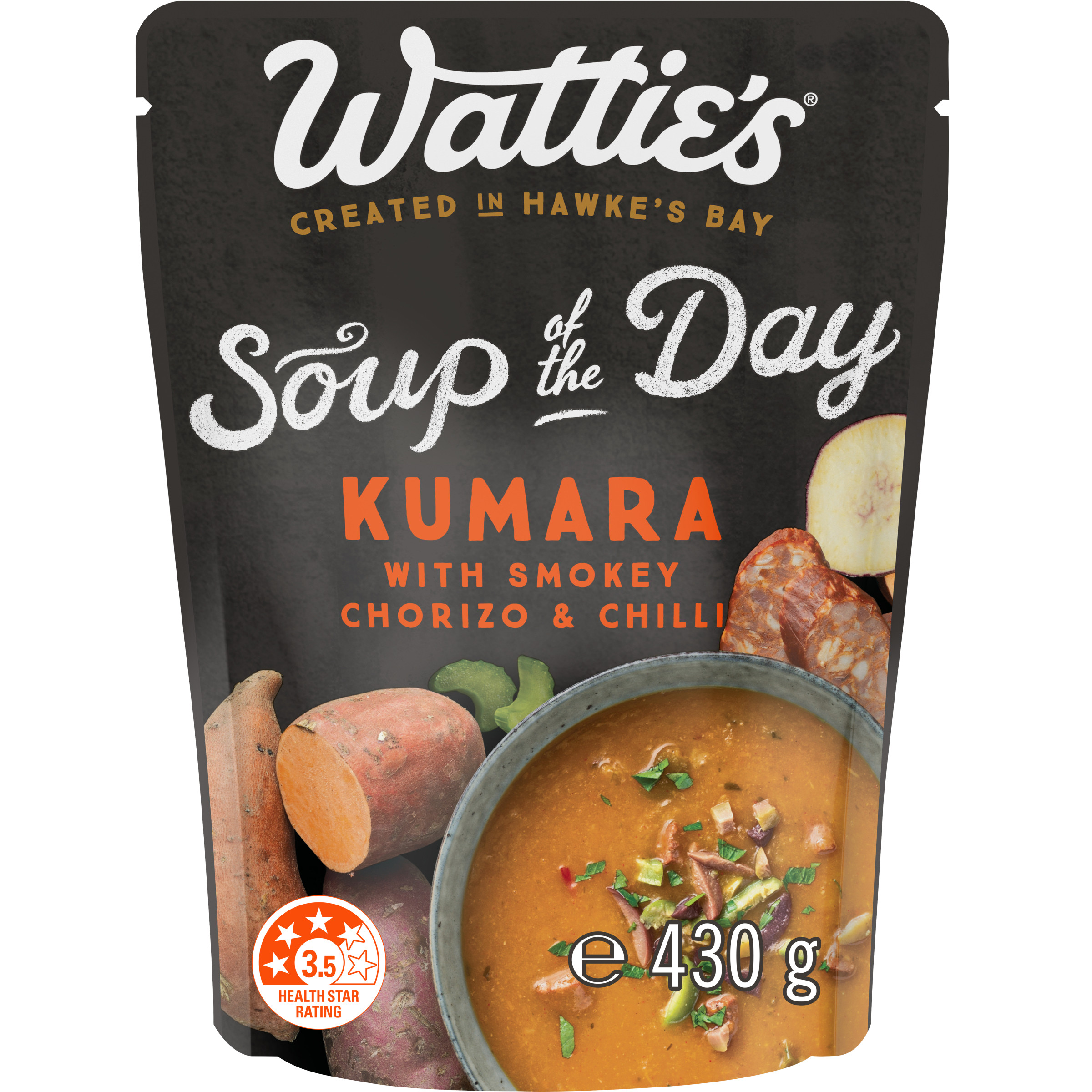 We've crafted Wattie's® Soup of the Day® Kumara with Smokey Chorizo & Chilli specially for you to enjoy delicious flavours at home or at work. Café...